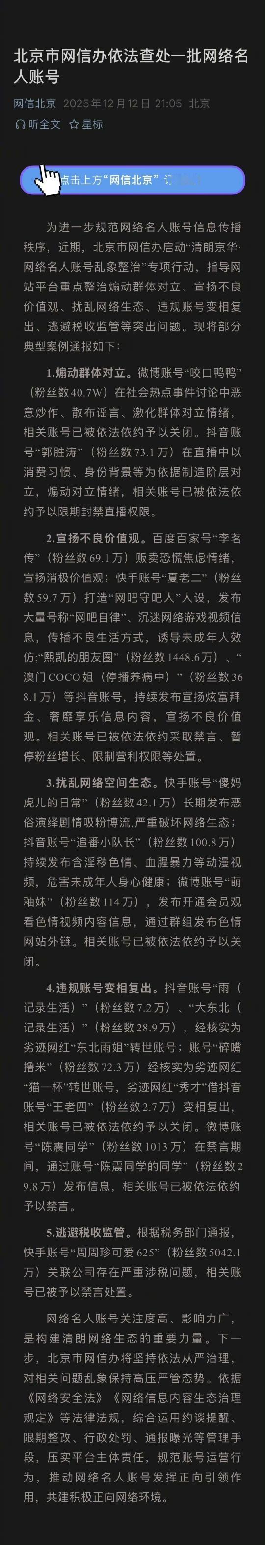 劣质网红复出再被封。 “东北雨姐”以“雨(记录生活)”“大东北(记录生活)”等账号复出,粉丝量分别达7.2万、28.9万,被核实为“转世账号”后👆关闭。 “猫一杯”以“碎嘴撸米”(粉丝72.3万)名义复出,同样被认定为转世账号并封禁。以前刚被封建时,不是跑到法国转战外网吗?咋失败?原因可能只是外网中文圈,没人有兴趣看什么小段子,只看涩涩。 “秀才”借“王老四”(粉丝2.7万)发布合拍视频,被关闭。 陈震通过小号“陈震同学的同学”发布信息,因未涉及永久封禁(B站封了,其他平台禁言),仅被禁言处理。这个人耐不住寂寞啊,当时才封一天,就在外网ins上发了两个帖子,几小时就删了。现在又挑战内网,纯属横跳找死。 网信办明确将运用Ai技术、跨平台点名单共享遏制“转世账号”,对复出行为“零容忍”。连声音都要封禁,你还想露脸?!封禁规则需明确“红线标准”与“复出路径”,避免“黑红也是红”的投机心态。