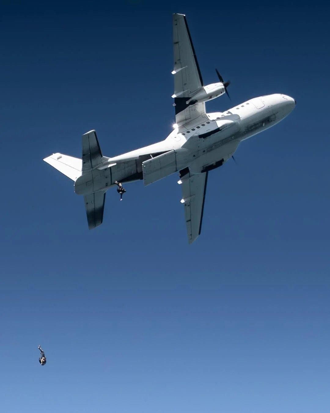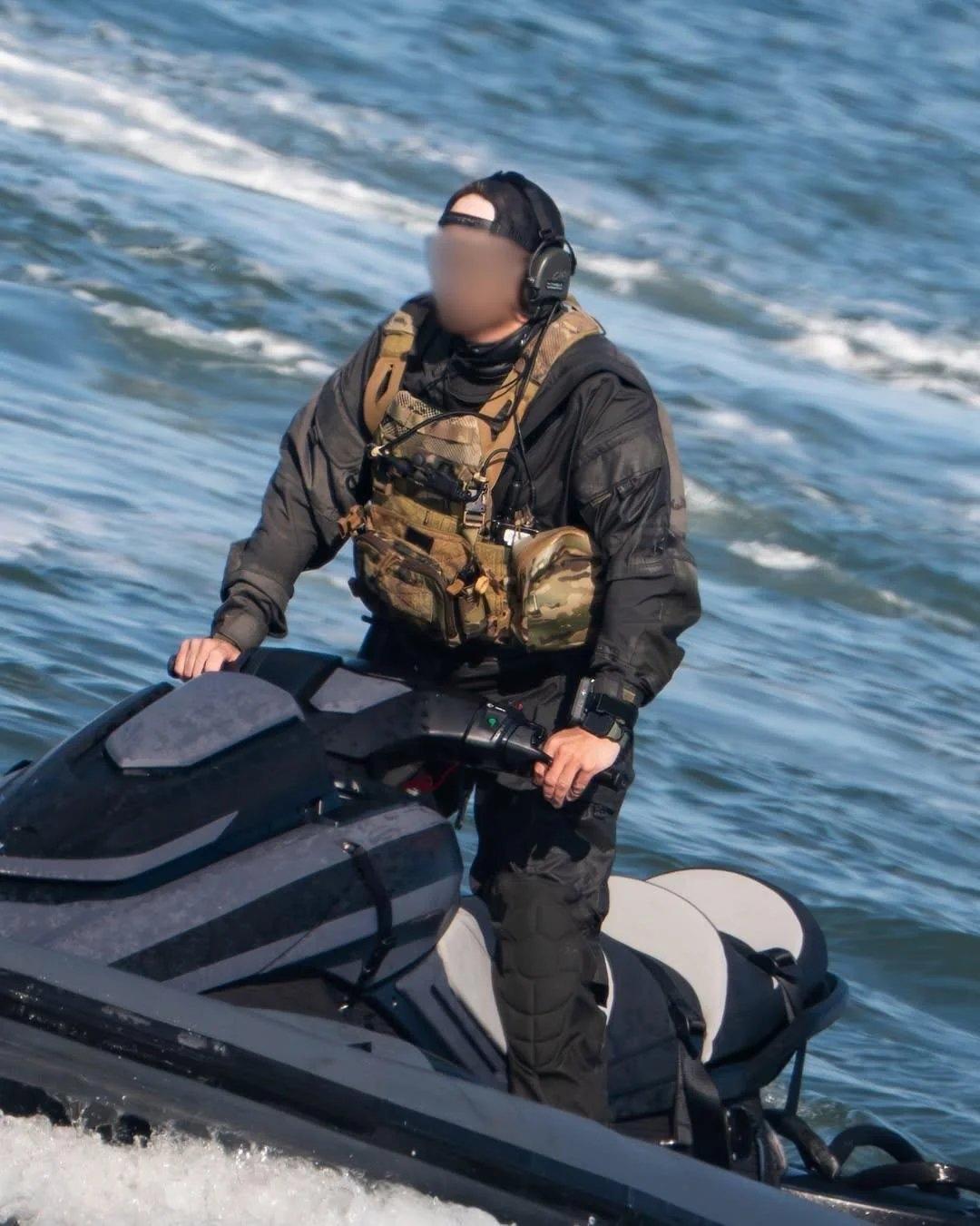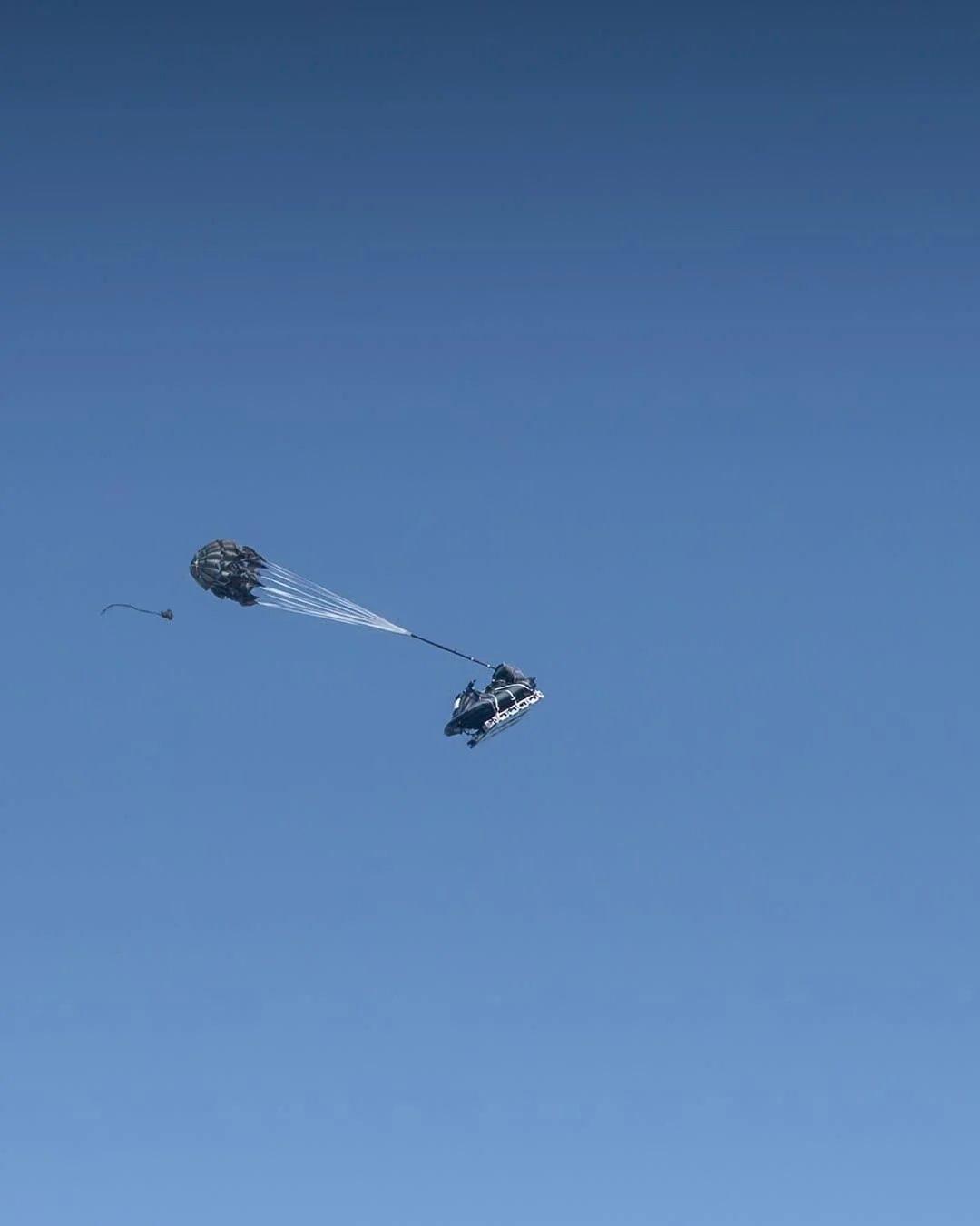 美国海军海豹突击队第六分队使用美国空军特种作战CN-235运输机上的水上摩托艇进行水上跳伞训练。