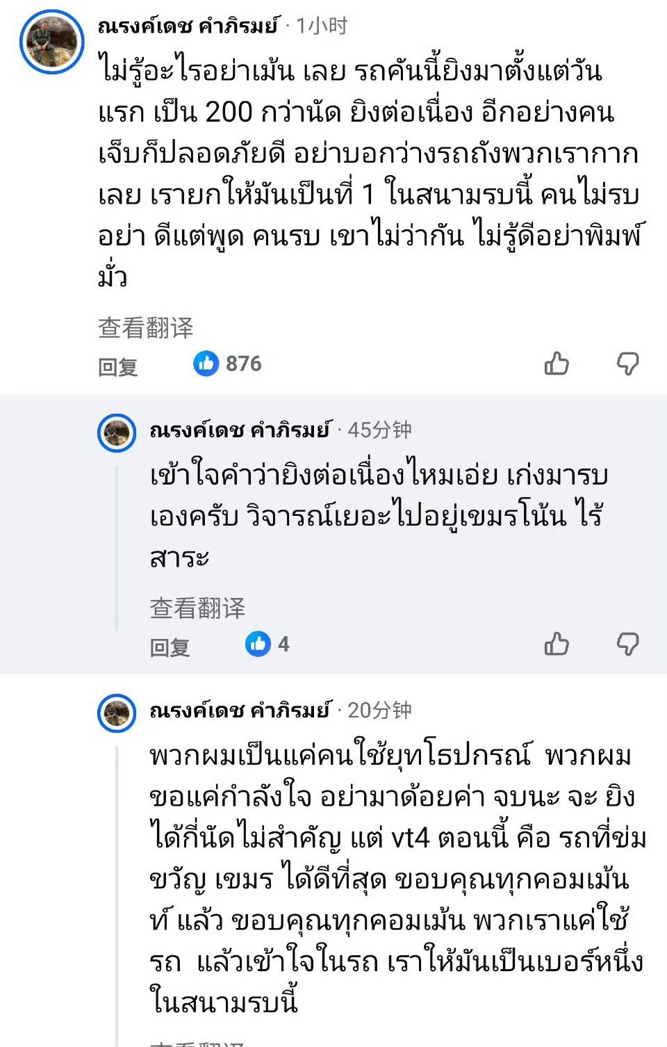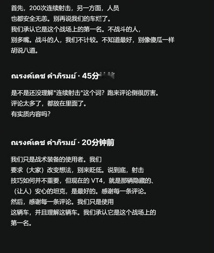 泰军 VT-4 坦克手评价损失掉的这辆 VT-4:“但现在的 VT4,就是那辆隐藏的、(让人)安心的坦克,是最好的。感谢每一条评论。我们只是使用这辆车,并且理解这辆车。我们承认它是这个战场上的第一名。”烽火问鼎计划