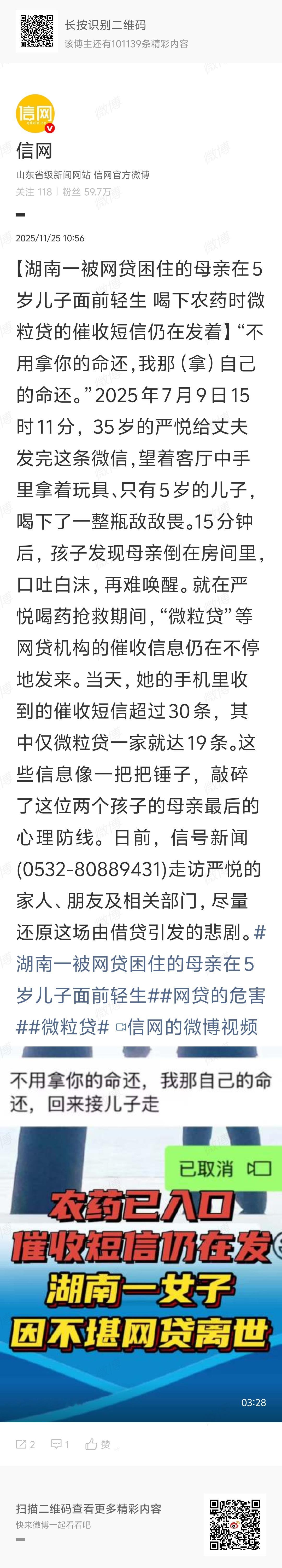 湖南一被网贷困住的母亲在5岁儿子面前轻生,喝下农药时微粒贷的催收短信仍在发着!