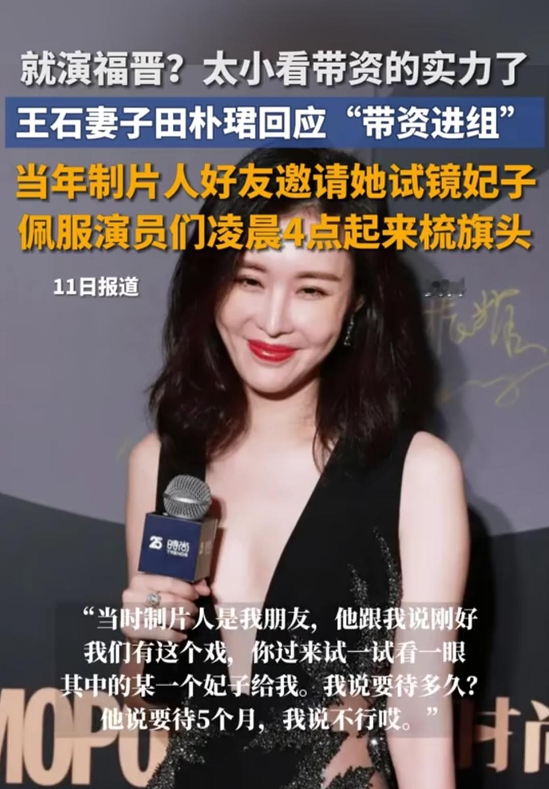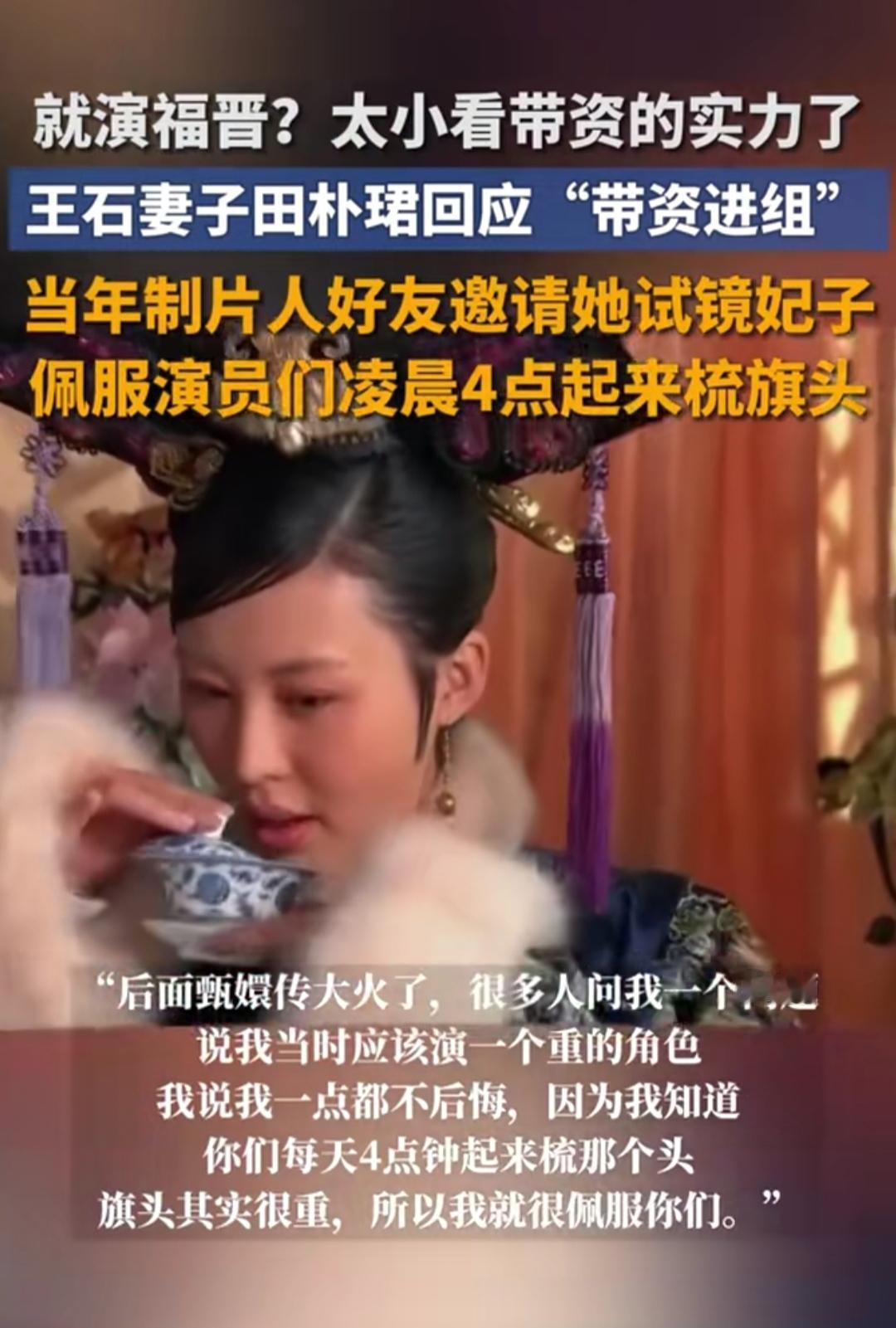 提起田朴珺和《甄嬛传》,“带资进组”的标签贴了十几年,可她的一番回应,才让人看懂什么叫清醒的分寸感! 制片人好友邀她试镜需要跟组5个月的妃子,她却正忙着地产项目结案,实在抽不开身,最后只选了戏份寥寥的敦亲王福晋,前后拍摄不过数日。 《甄嬛传》爆火后,有人替她惋惜错失良机,她却直言打心底佩服演员凌晨4点梳旗头的辛苦,从没想过借着人情去占角色。 她还笑着调侃“带资进组演这么小的角色,太小看带资进组的实力了”,一句话戳破谣言。 我们总爱用“资本”“背景”去揣测别人的选择,却忘了真正的体面,是不越界、知敬畏,不耽误别人的专业,也不勉强自己的节奏。
