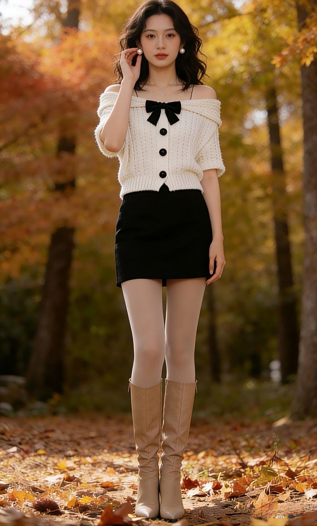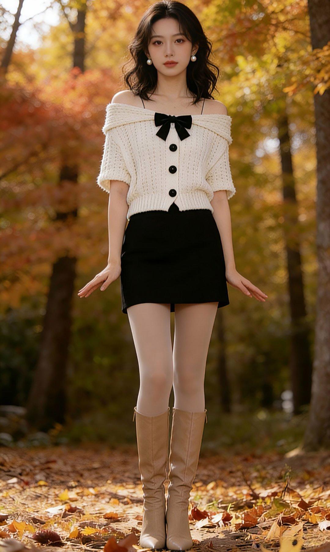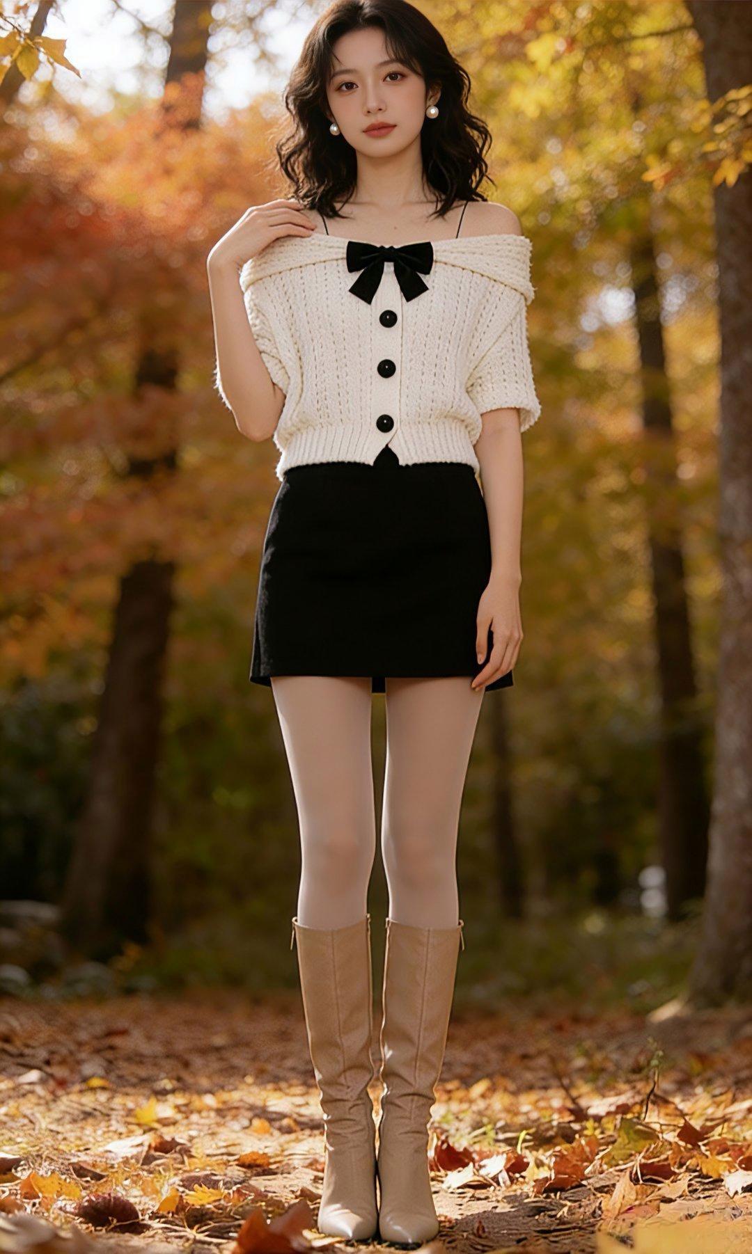 一字肩针织衫是这套穿搭的灵魂,粗针织纹理自带温柔质感,黑色蝴蝶结点缀在领口,甜妹气息拉满,露肩设计还能勾勒出优美的肩颈线条。搭配黑色高腰短裙,经典的黑白配色简约又高级,珍珠耳钉的点缀,让精致感悄悄藏在细节里。