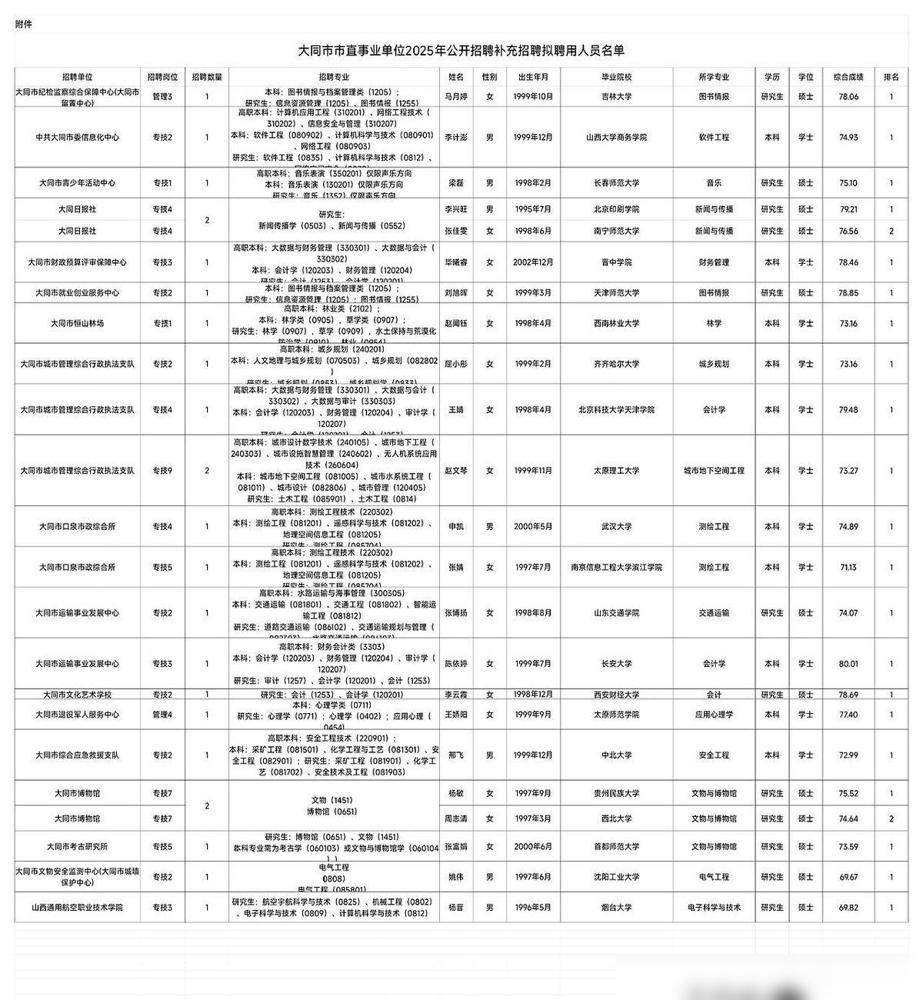 就刚刚,刷到大同市事业单位的拟聘名单,我直接倒吸一口凉气。 26个岗位,一半是