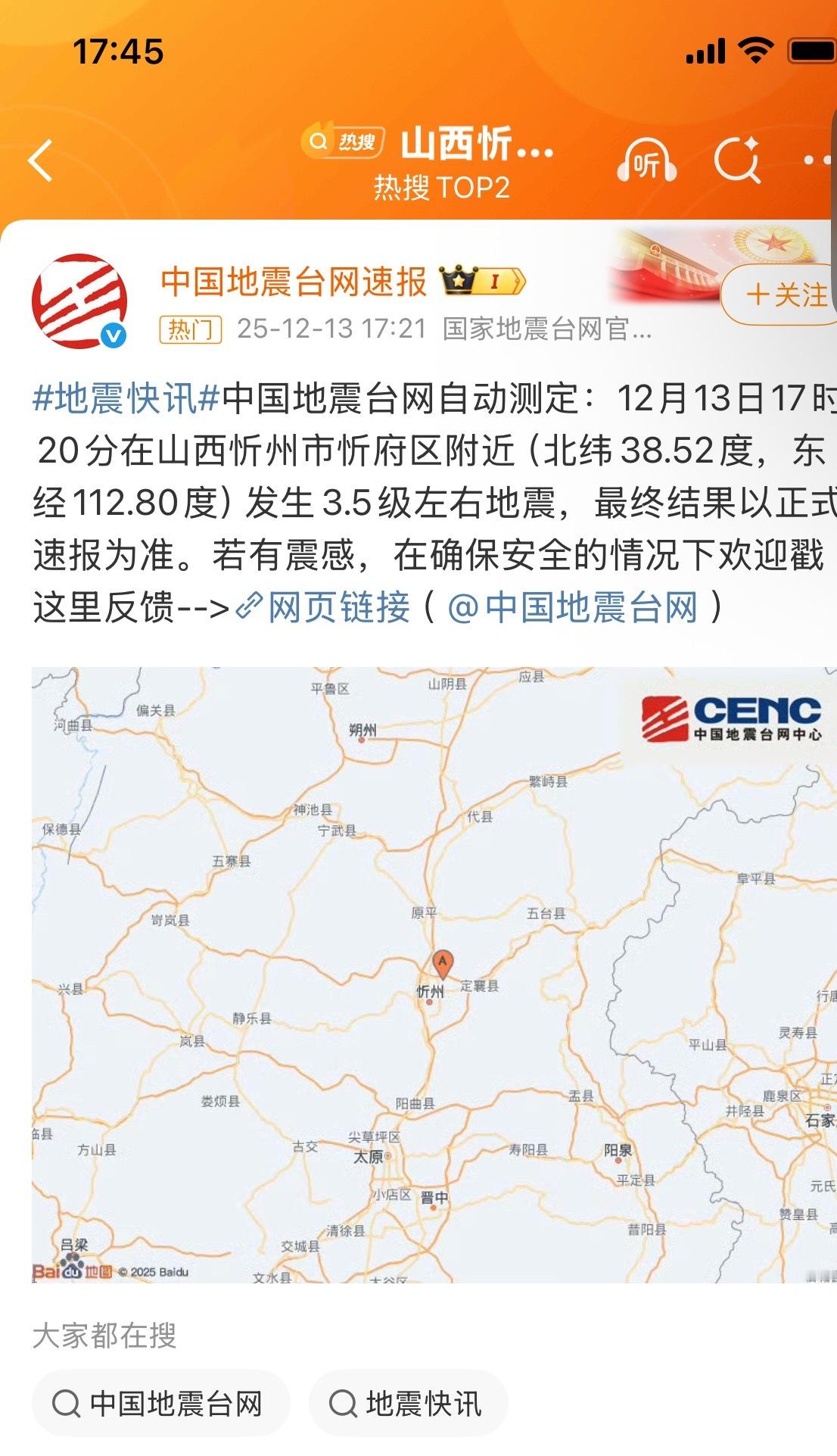 山西忻州3.4级地震又地震了,这个震级应该有震感。冬天了,天又冷,希望都平平安安