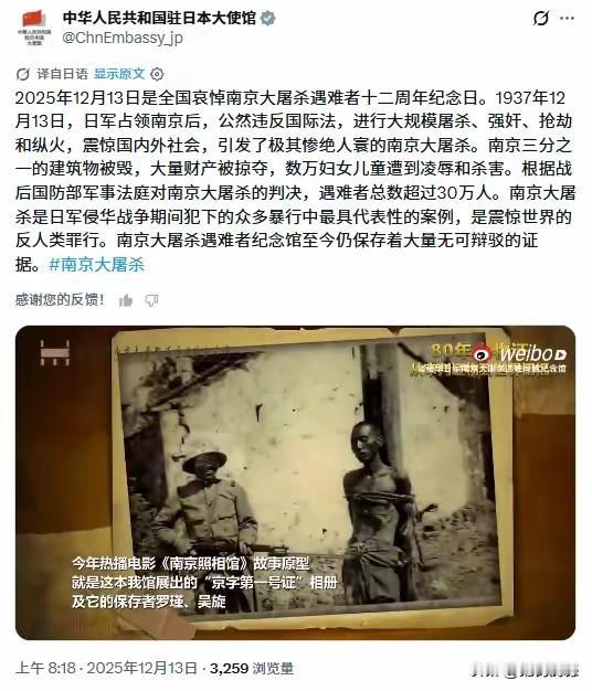 驻日大使馆发的这段文字,深刻揭露了日本鬼子的罪行,在12月13日这个日子里,驻外使馆都应该发这样的文字,让全世界人民都了解日本鬼子在我们这里犯下了滔天罪行,让全世界人民都了解这段历史!