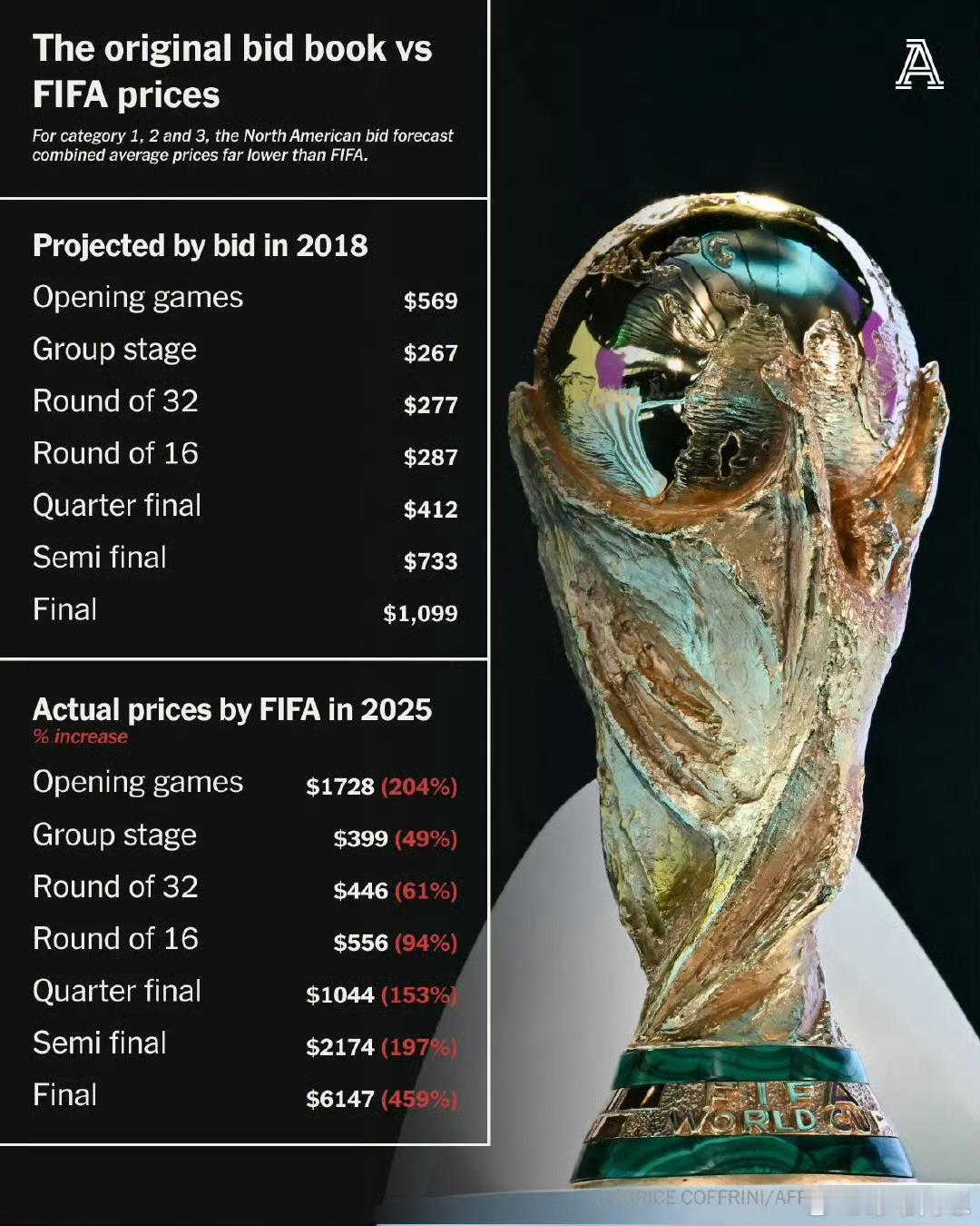 国际足联本周公布的2026年男子世界杯票价,较美国、加拿大和墨西哥联合提交的官方申办报告中预测价格平均高出174%。作为申办世界杯的官方流程环节,申办国必须提交申办报告,供国际足联及全球各足球联合会审阅评估,并据此投票决定主办权归属。这份将美、加、墨三国申办方案整合的"联合申办报告",由国际足联于2018年3月正式发布。该报告中的票价预测本就偏向高位,因为联合申办方当时需要向国际足联及其全球成员协会证明,北美世界杯能为全球足球生态系统带来丰厚收益。然而即便是联合申办方当初的较高预测,在上周末世界杯抽签仪式后国际足联公布的实际票价面前,仍远未达到其水平。