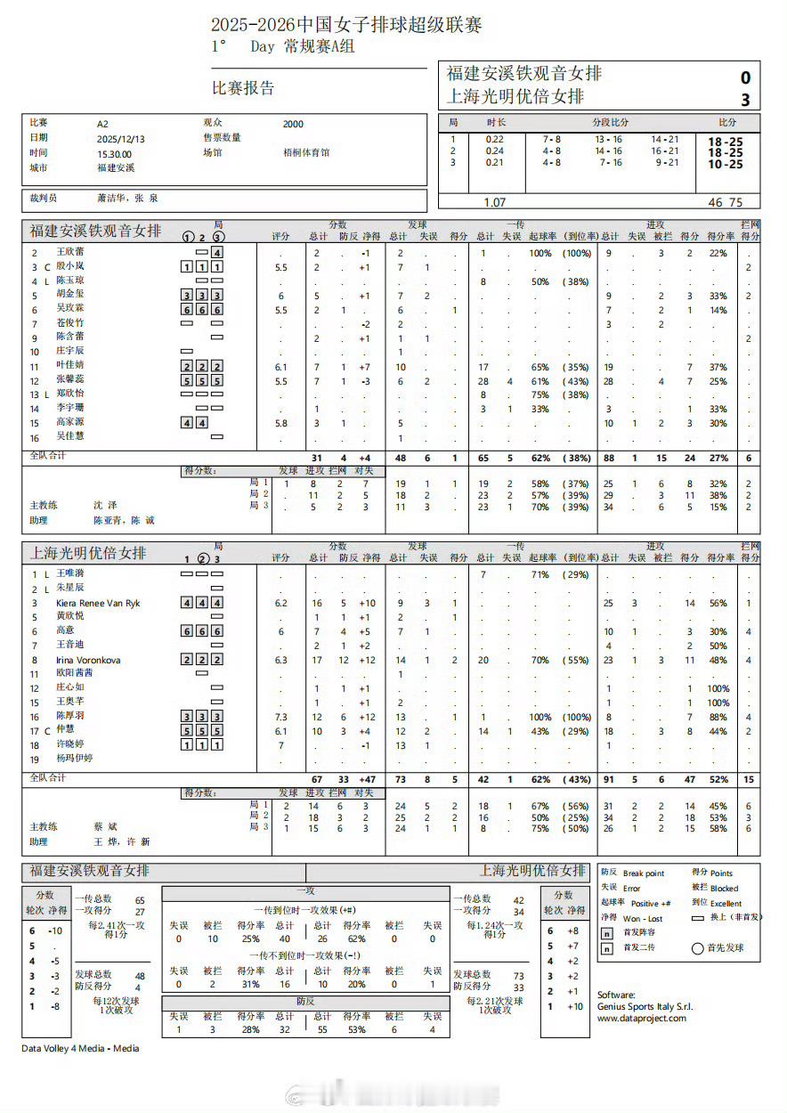 福建女排0-3上海女排详细技术统计2025-2026中国排球超级联赛排超联赛