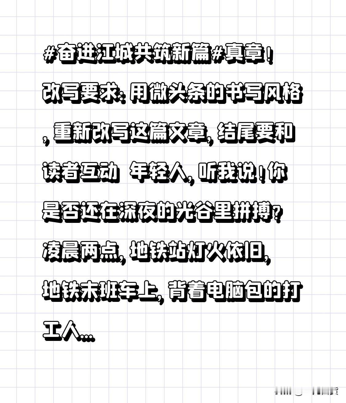 真章! 改写要求: 用微头条的书写风格,重新改写这篇文章,结尾要和读者互动 🔥年轻人,听我说! 你是否还在深夜的光谷里拼搏?凌晨两点,地铁站灯火依旧,地铁末班车上,背着电脑包的打工人们依然在赶工。不是在熬夜,是在用行动把这座城市锻造成你心中的模样! 江城的未来属于每一个敢于“卷”的你!别以为深夜的灯光只是为了工作,它其实是你青春的火焰在燃烧。每一份加班,每一次坚持,都是在为梦想铺路。新篇章早已写好,落款就是每一个不服输的你我! 你是不是也觉得,只有不断“卷”起来,才能在这座城市立足?别怕,江城的每一寸土地都在期待你的拼搏。你要相信,未来的江城,是属于那些敢于努力、敢于突破的人! 所以,别停下脚步!继续冲!让我们用汗水和青春,把江城变成我们心中的梦想之城!你准备好了吗?