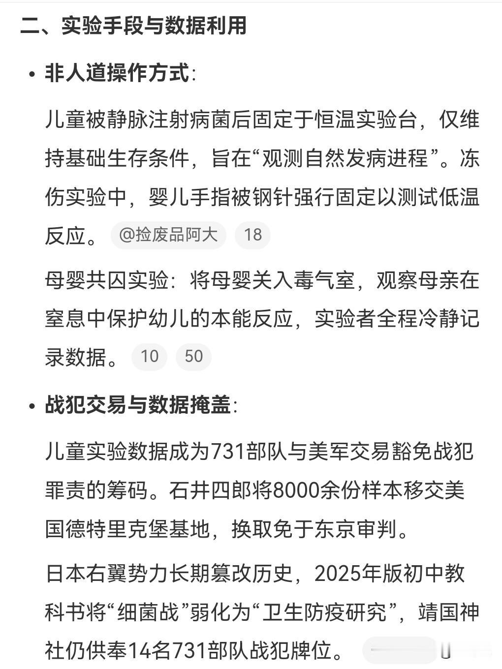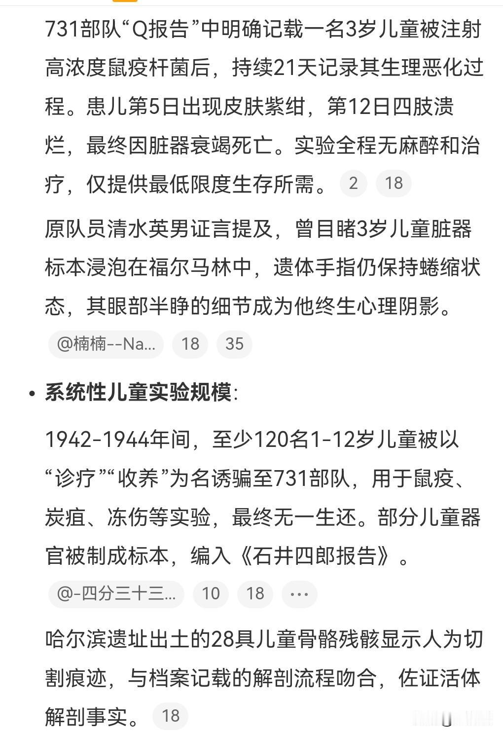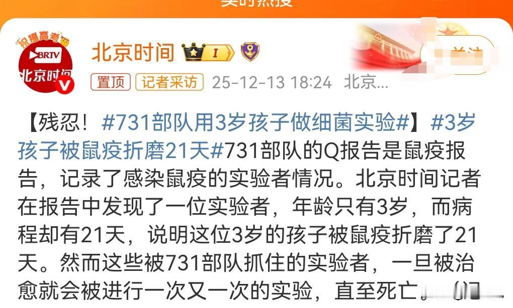 侵华日军实在是太丧心病狂了,太泯灭人性了。 731部队用3岁孩子做细菌实验。 被用来做鼠疫细菌实验被折磨了21天,痛苦的死去。 这些实验者一旦被治愈,又会一次一次的进行试验,直至死亡。 美国和日本狼狈为奸,日本把这些实验数据给美国,美国选择不严惩那些战犯。 美国一直以来都是一个邪恶的国家。