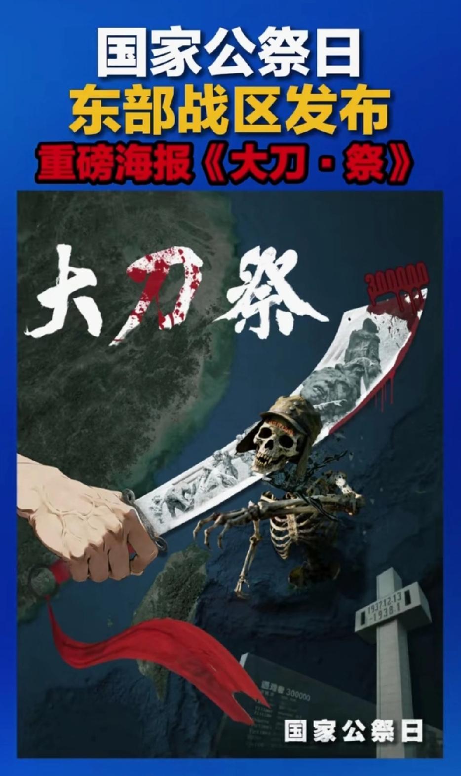 国家公祭日,东部战区一张《大刀·祭》海报看哭无数人——没有华丽特效,却用一把长刀、几句短诗,撕开了民族最深的集体记忆! 88年前的南京,30万同胞倒在屠刀之下,山河破碎、生灵涂炭,那段黑暗岁月成为中国人永远的痛。海报上的大刀,曾是先辈们保家卫国的武器,每一道刀痕都刻着抗争的不屈,每一寸刀锋都燃着救亡图存的怒火,它不仅是兵器,更是民族脊梁的象征。 如今我们生活在和平年代,却不能忘记和平是用鲜血换来的。海报配诗“长刀所向靖狼烟”,不是要延续仇恨,而是提醒我们:铭记历史不是为了复仇,而是为了不让悲剧重演。军国主义的幽灵从未远去,唯有吾辈自强,才能守护山河无恙。 国家公祭日,从来不是一个普通的日子。它是对遇难同胞的告慰,是对历史的敬畏,更是对未来的警示。愿我们永远记得:以史为鉴,警钟长鸣,这才是对先辈最好的告慰,对和平最好的守护!