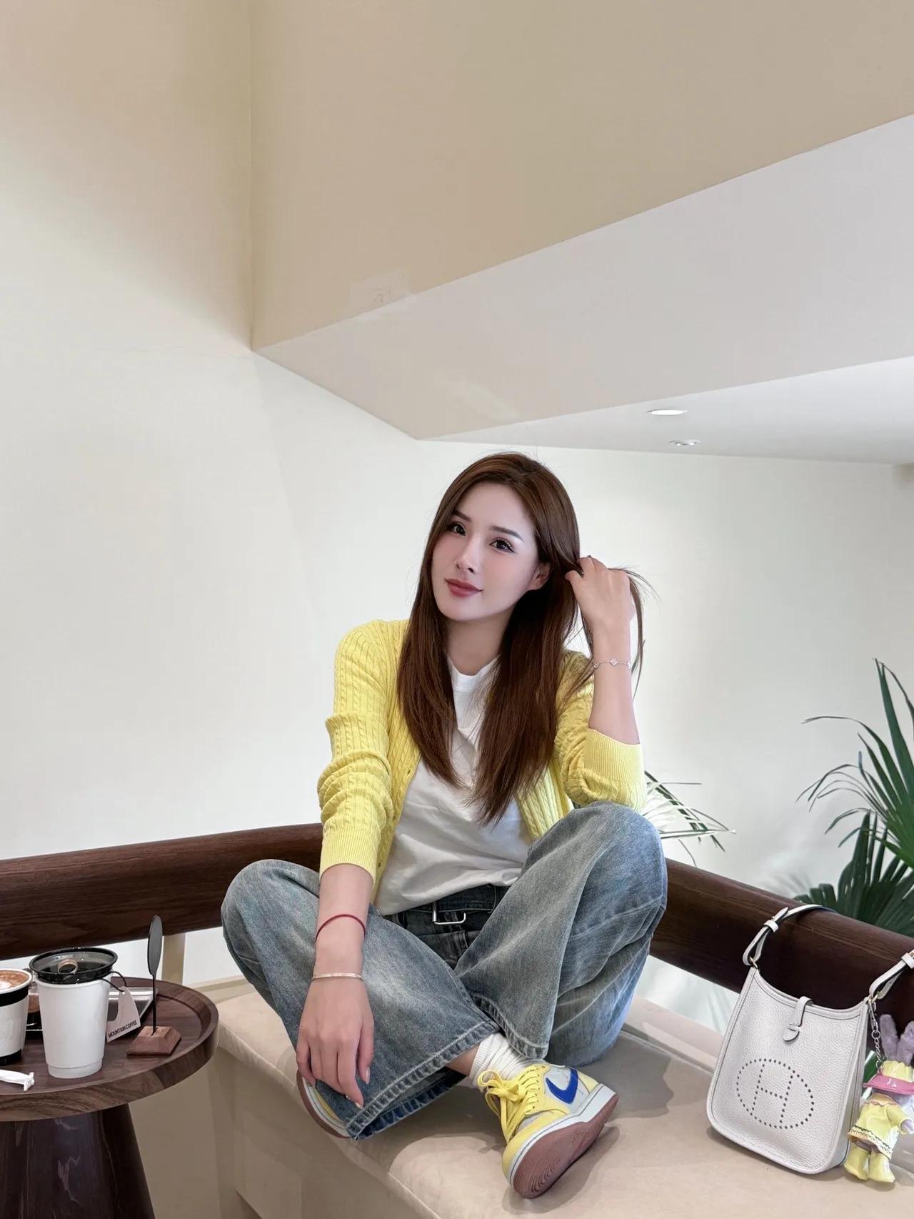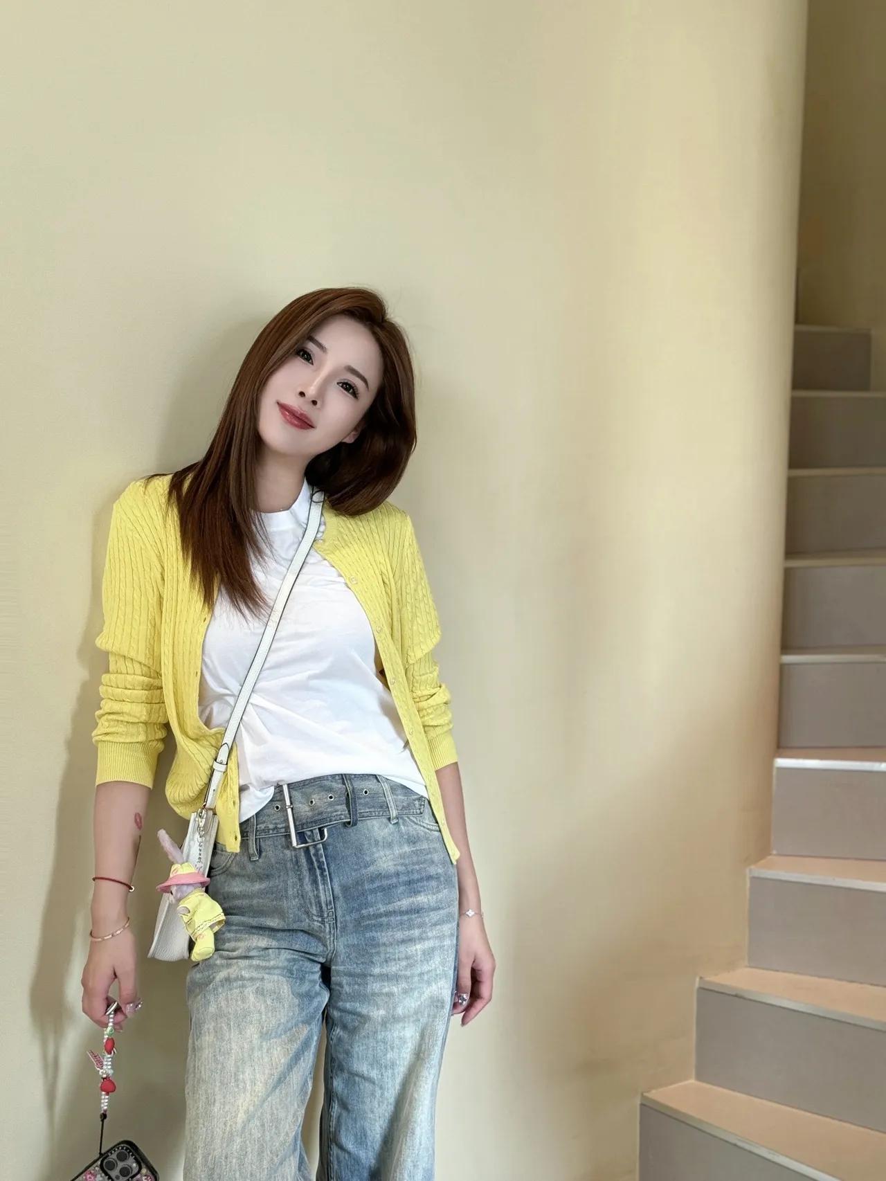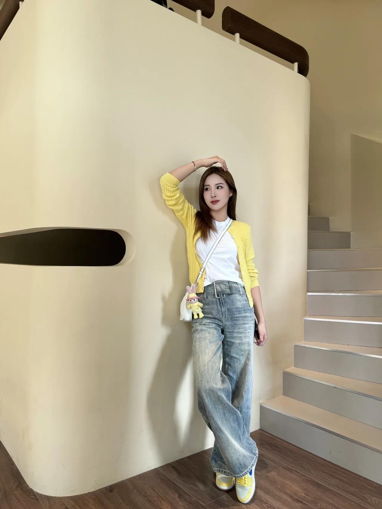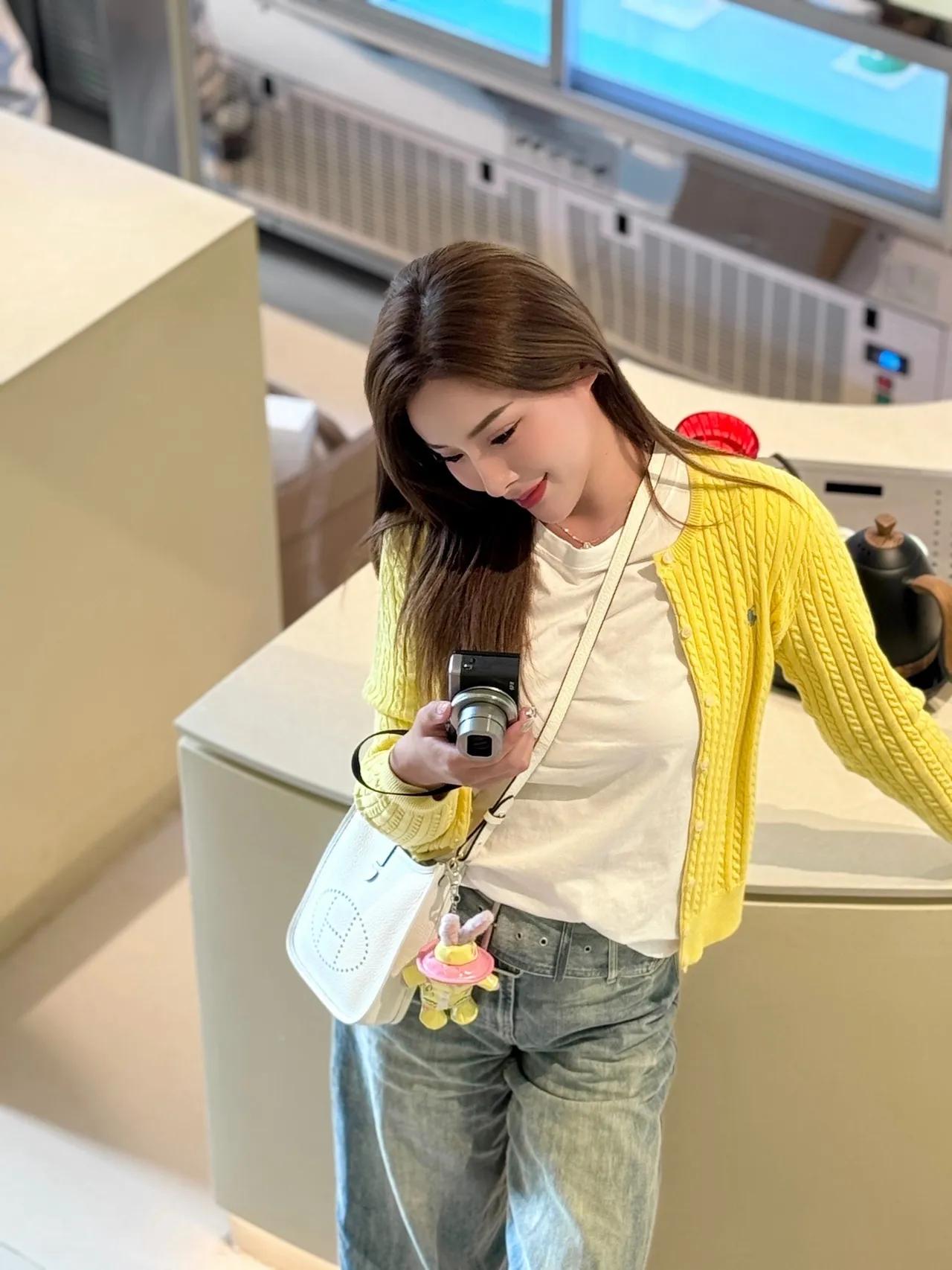 黄色毛衣+牛仔裤,清新甜美,搭配可爱小包包,元气满满!🌞💕