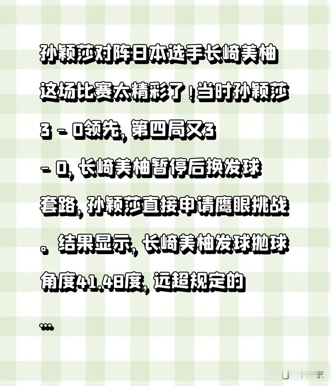 2025年12月12日WTT香港总决赛女单1/4决赛,孙颖莎对阵日本选手长崎美柚这场比赛太精彩了!当时孙颖莎3 - 0领先,第四局又3 - 0,长崎美柚暂停后换发球套路,孙颖莎直接申请鹰眼挑战。结果显示,长崎美柚发球抛球角度41.48度,远超规定的30度上限。孙颖莎顺利拿下这分,最终4 - 0横扫对手晋级四强。 赛后孙颖莎轻描淡写回应,说就觉得那发球40多度,随便挑战一下。不得不说,孙颖莎这眼力和判断力太牛了,世界第一实至名归! 大家觉得孙颖莎接下来半决赛对阵蒯曼,会打出怎样的精彩表现?孙颖莎的鹰眼挑战会不会成为比赛经典时刻被反复提及?国乒包揽女单四强,最终冠军会是谁呢? 孙颖莎 球星孙颖莎 孙颖莎演技 球星孙颖莎 孙颖莎街拍 孙颖莎广告花絮 孙颖莎积分 孙颖莎自拍 无赛场 孙颖莎 孙颖莎广告