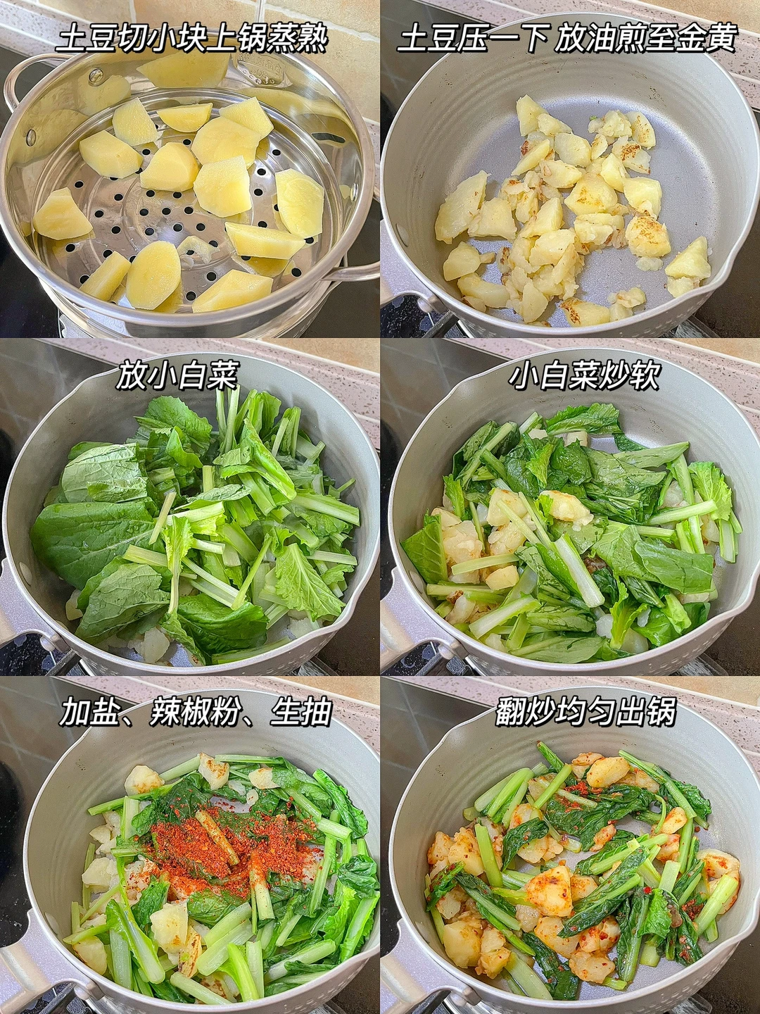 喜欢吃土豆的姐妹真的要去试试!土豆蒸过以后只需要放一点点油,煎出脆壳再放小白菜。放辣椒粉和盐,下次试试加点肉末感觉会更好吃。土豆搭配小白菜,真的是好吃又简单呢~