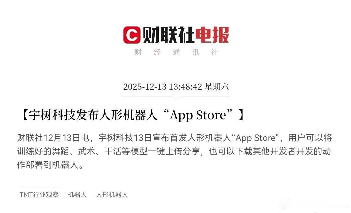 大利好!大利好!宇树科技发布重磅利好!不出意外的话,下周人形机器人板块要起飞了,满仓机器人概念的,晚上可以加大鸡腿了下午1点48分,财联社最新消息,宇树科技今日重磅首发人形机器人“APP Store”,这个突发利好消息来的太及时了,这将会是一个再次点燃人形机器人板块重要催化剂,“APP Store”就是应用商店,这标志着宇树科技开始有意识地构建“硬件+应用生态”的商业模式,这模式通过降低使用门槛和激发第三方创造力,来解决当前应用场景有限、开发成本高的难题,如果这一模式被验证可行,或将引导更多人形机器人企业加入生态建设,共同推动人形机器人产业从步入新的发展阶段,这对于整个人形机器人产业是重大突破,太厉害了股民们!坐稳扶好,受此利好消息影响,预计下周一人形机器人又要成为市场的热点题材火力全开了!