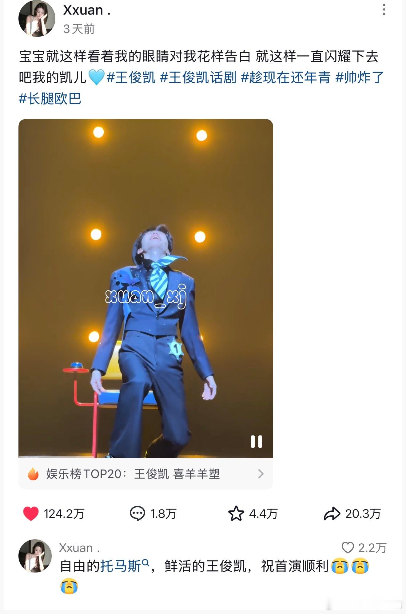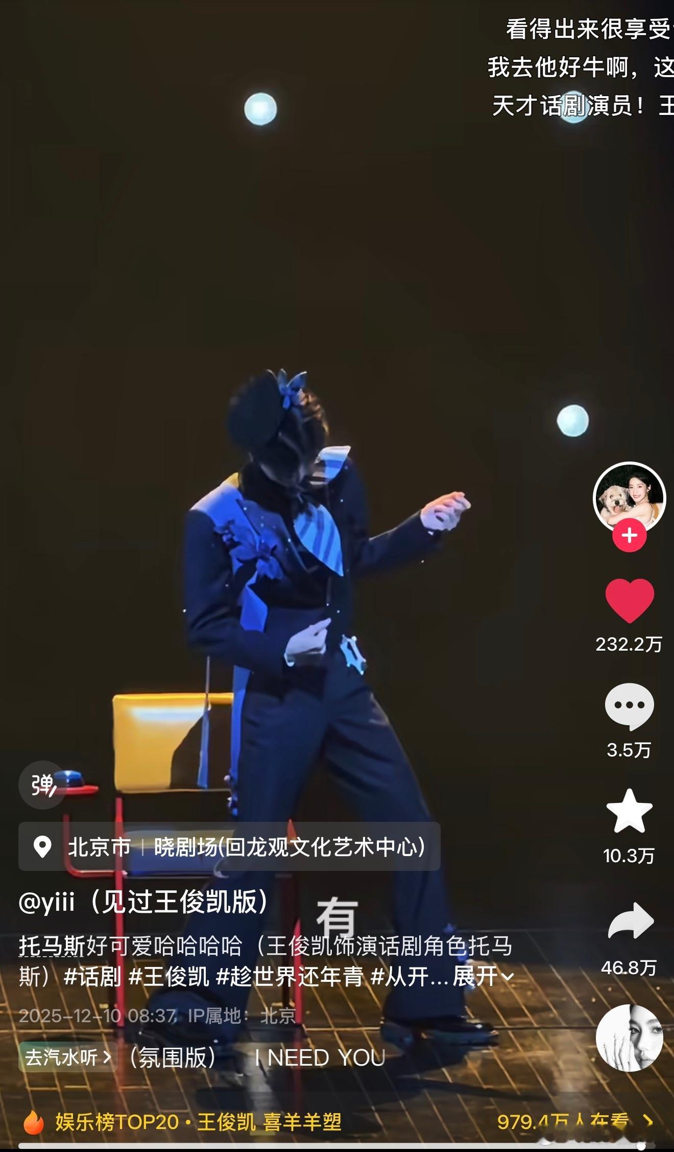 王俊凯被抖人说是内娱喜羊羊不到三天两句台词,十五秒的表演,在抖收获一个200w➕,一个100w➕,近十个50w➕点赞,十几万的数不胜数