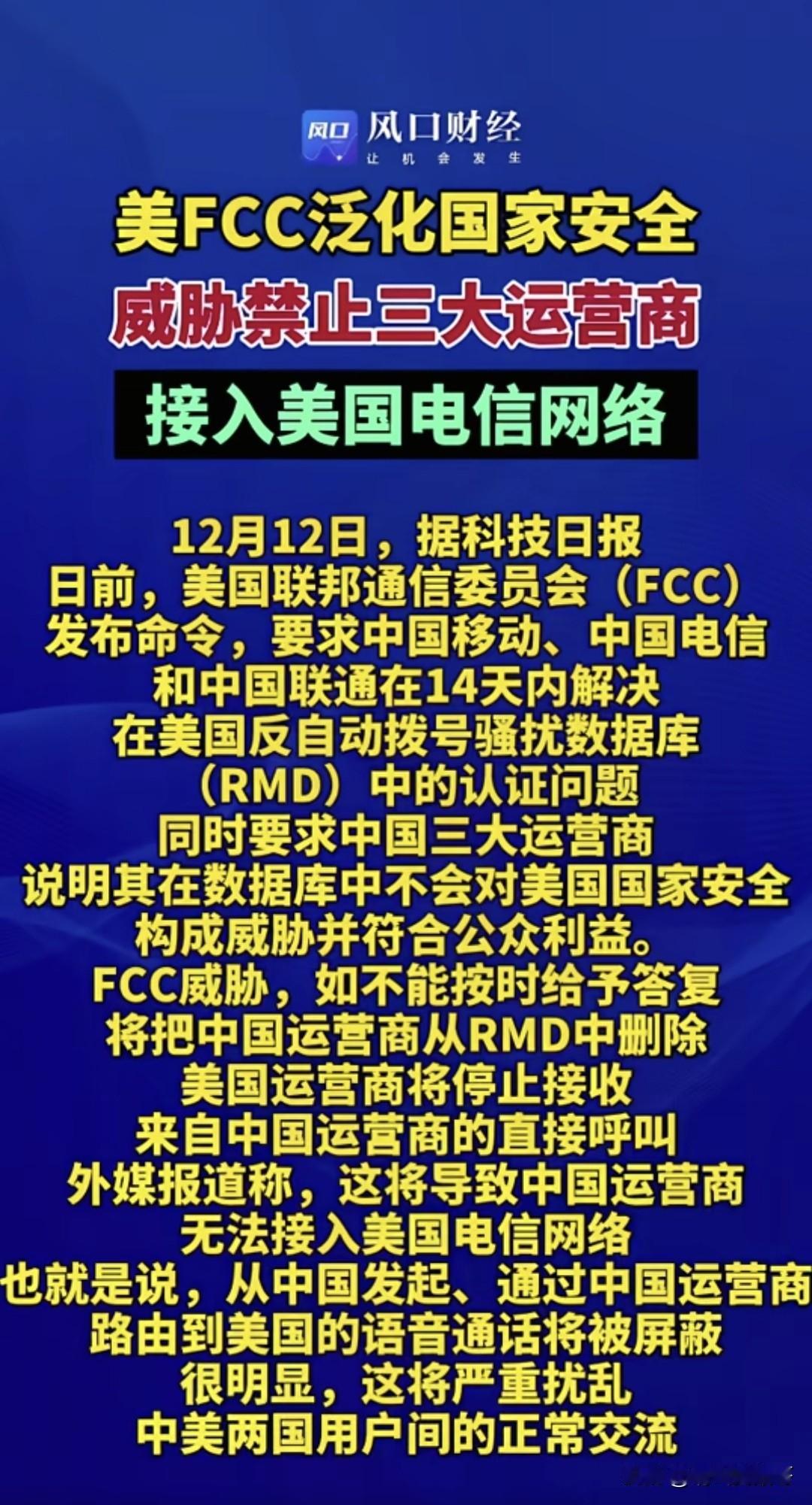 美国FCC这次针对三大运营商的最后通牒,肯定让他们头疼。完不成整改,会被禁入美国电信网络,完成吧,对国内用户又不好交代,毕竟如果对外能在技术层面解决骚扰电话的问题,对内也一定能够解决。 目前广大用户这些年也都苦恼于骚扰电话和诈骗电话,接下来就看三大运营商在规定期限内怎么应对了。如果到时候按FCC的要求完成整改了,那就只能说明那些骚扰电话从一开始就是“狼狈为奸”的做法,到时候搞不好就会变成过街老鼠人人喊打,最终信誉扫地。