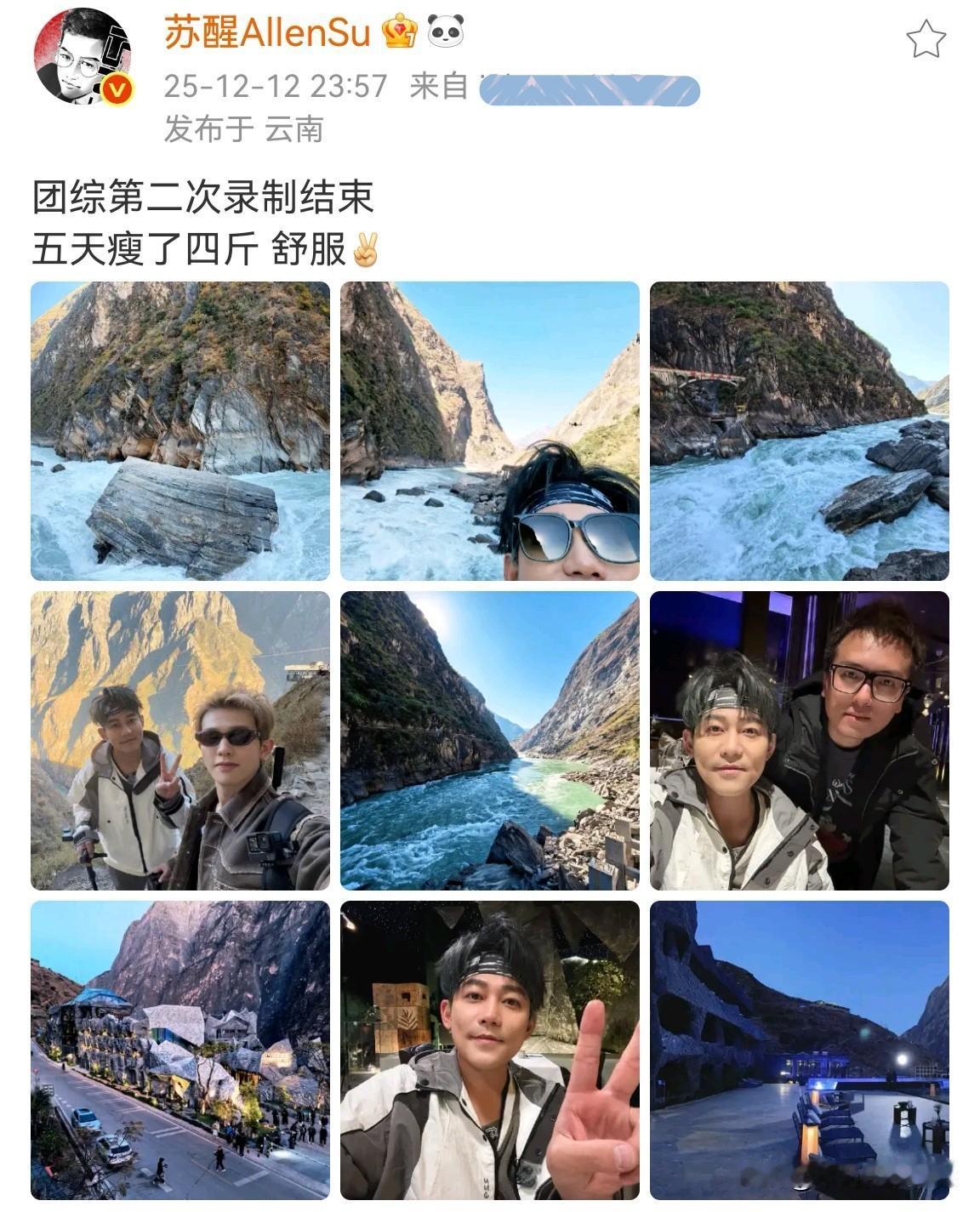 近日,苏醒发文说:“团综第二次录制结束,五天瘦了四斤,舒服。” 目前,再就业男团团综《快乐老友记3》第二轮录制已完成,据说本月开播,我们期待一下吧。 醒哥发了9张图片,其中有一张是生哥,难得看到苏醒发陈楚生的照片,还有一张是他与十个勤天李昊的合影。 当初,《种地吧》第一季开播时,再就业男团作为撑伞人去支持十个勤天,还给种地少年们点了丰盛的饭菜 。 现在十个勤天火了,弟弟们也来支持哥哥们的团综啦,这就是双向奔赴的爱,希望再就业男团与十个勤天友谊长存。
