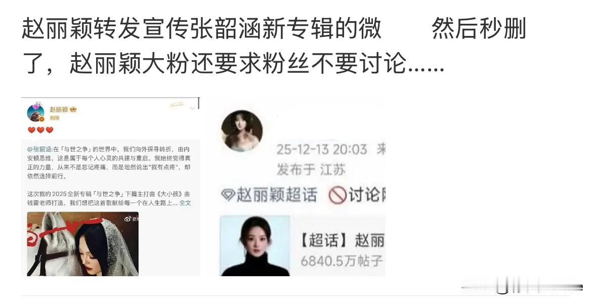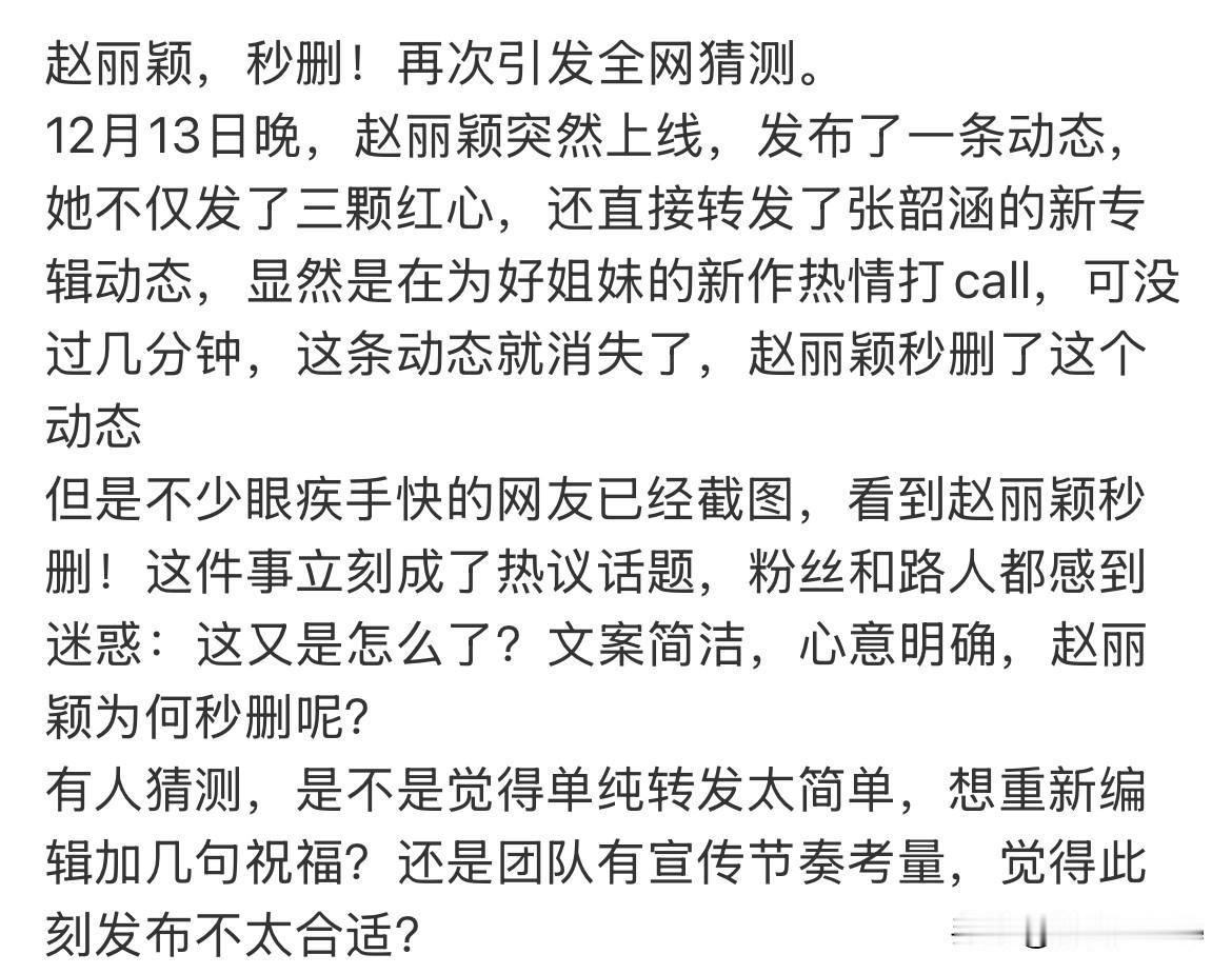 12月14日,赵丽颖摊上事了!昨晚发文秒删,这事可大可小,今天必上热搜! 网友怀疑她的思想是不是被赵德胤带跑偏了! 以前对于任务文非常积极响应的她,自从跟赵德胤在一起后就变得不积极了,你要说十一不发,是人没上网,没发,勉强理解…… 昨天她上网了而且还发了其他内容,就是不发任务文这点,很容易被人挑理! 你可以特立独行,你可以有自己的风格,但态度起码要是端正的,在思想上给喜欢你的人起一个好的带头作用,明明看到了,故意不发,挑着发,不太好吧!这事今天要热搜!