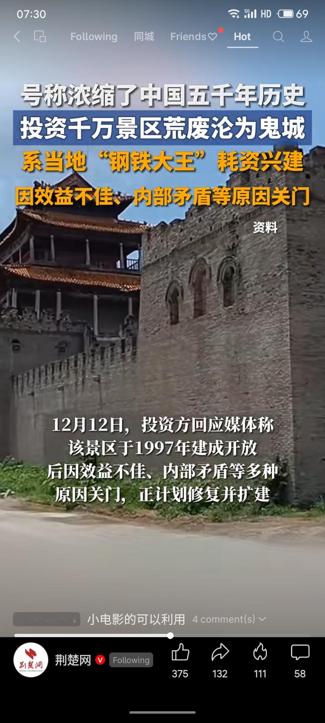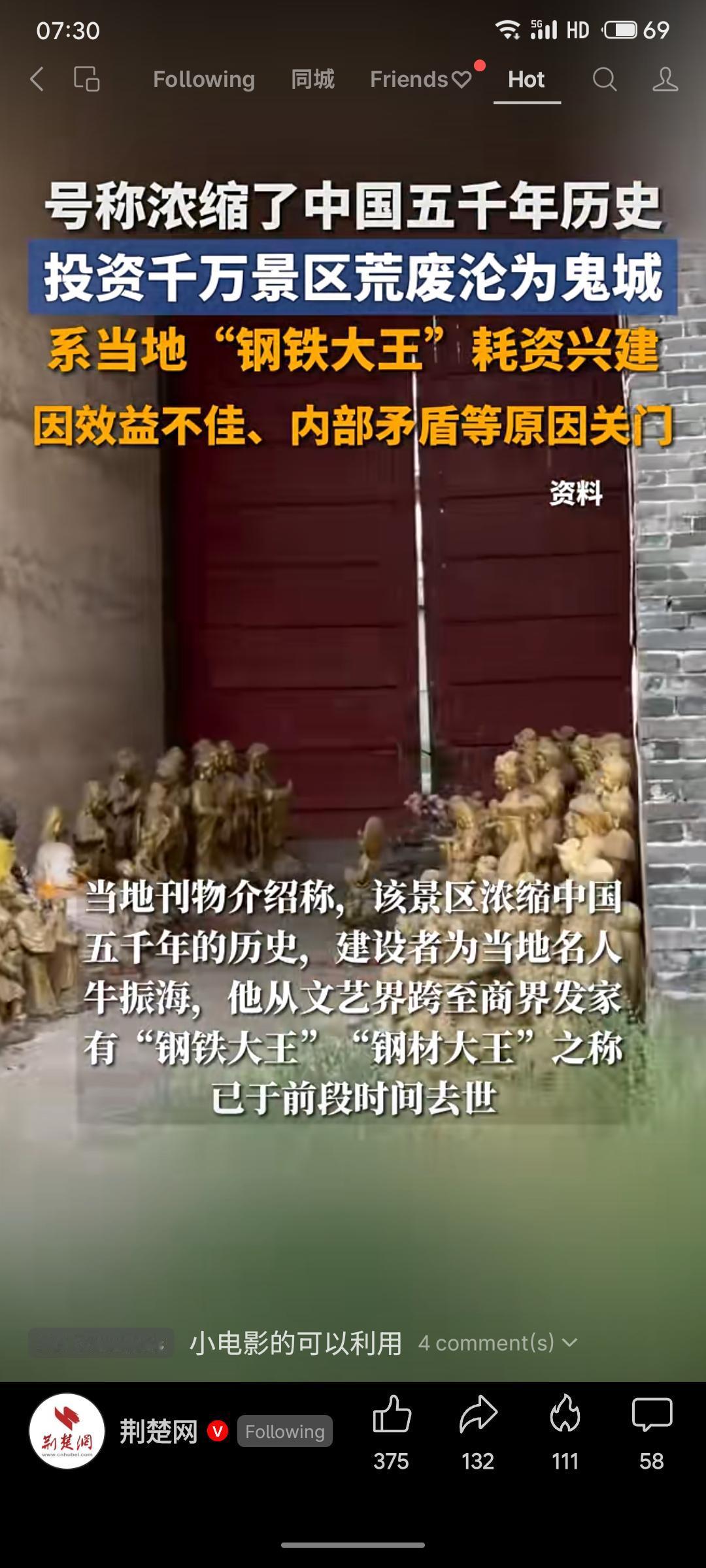 河南周口“中华五千年”景区由当地企业家牛振海于1997年投资兴建,曾号称浓缩中国历史。后因经营效益不佳、内部矛盾等原因关闭,逐渐荒废。近日投资方表示,正计划对其进行修复与扩建。