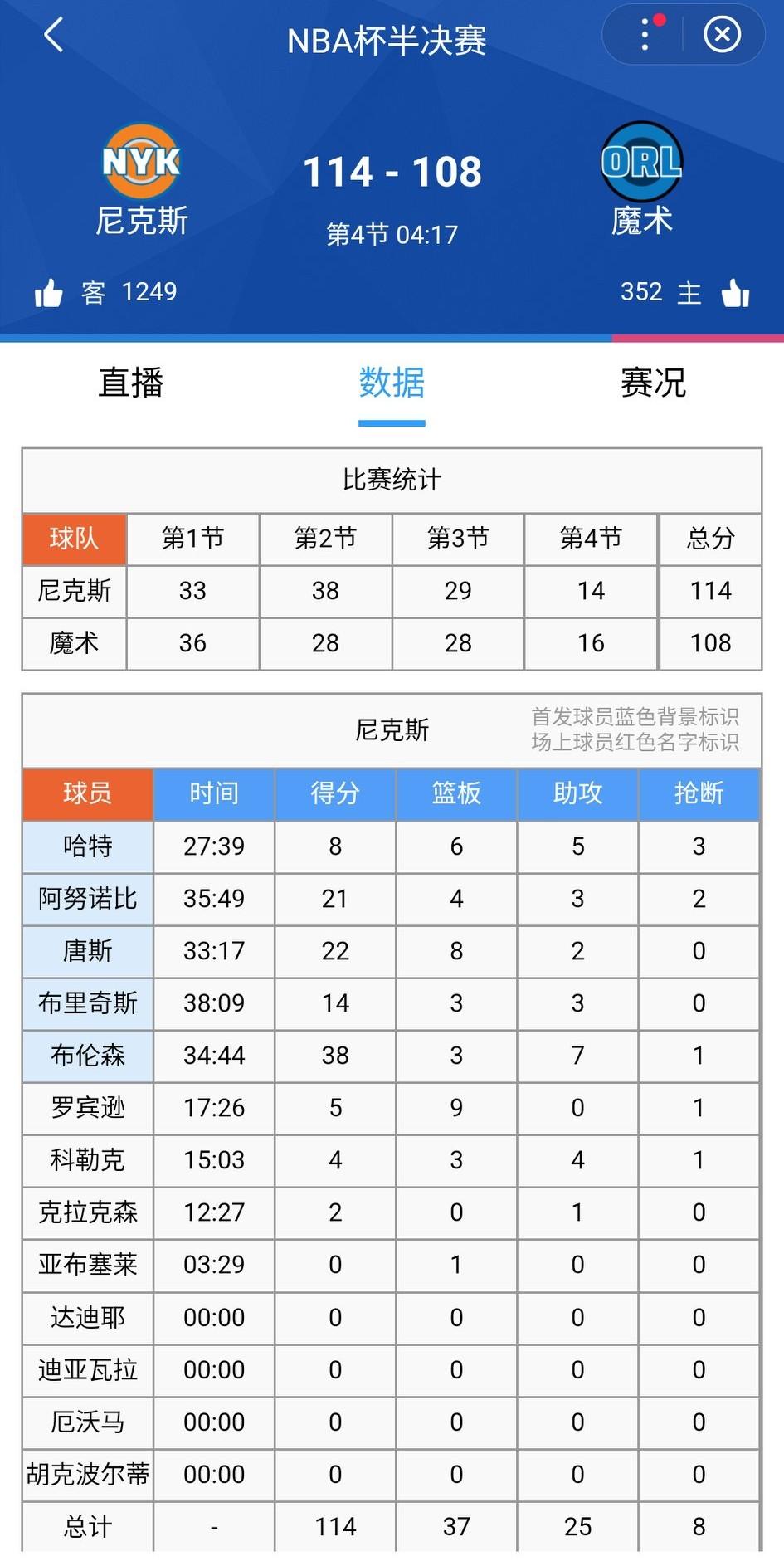 什么是最佳防守?进攻就是最好的防守?布伦森两节半30分,现在已经是38分,可惜萨格斯伤了…… 还有4分钟比赛结束,尼克斯114-108领先魔术,结果朝着有利于尼克斯前进。 毕竟拿到NBA杯冠军,每人就有50万美元奖金。