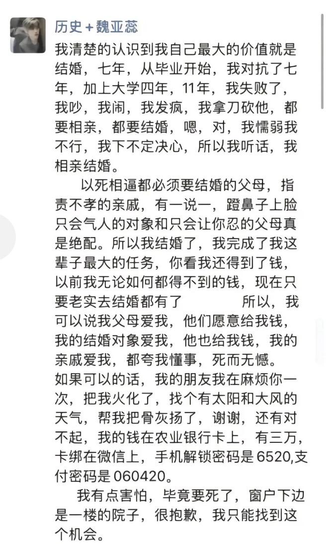 河南平顶山一名年仅28岁的女生,在当地最好的高中当老师,人长的漂亮,工作稳定而且还体面,却在结婚当天从小区7楼一跃而下,到底是发生了什么,让她如此的决绝? 结合多家媒体的披露,以及她在朋友圈的截图,我总算是拼凑出了一个模糊的答案,这一切都跟她原生家庭脱不了干系。女孩从大学的时候,就已经在承受被催婚的压力。在大学毕业之后,承受的压力更大了。不仅是来自父母的,还有来自亲戚的。她为此曾反抗过,可她抗争的越激烈,众人的指责越是强烈,在抗争7年之后她妥协了。 她听从了父母的安排选择了相亲,像是菜市场上的大白菜一样,在被人围观和挑选。最终她与一个看起来不那么讨厌的男人,举办了订婚仪式敲定了结婚日子。看完终于要完成了人生大事,父母开始对她有了很大的改观,不再指责她的不孝,愿意给她花更多地钱。而曾经对她颇有微词的亲戚,也开始夸她懂事。 周围人对她态度的变化,让她清醒地认识到,自己最大的价值或许就是结婚,只要她能结婚就行,不管是和谁结婚,不管是否幸福快乐。那一刻的她绝望了,所以才在大喜当天,趁着他人的不注意,从7楼一跃而下。那一刻的她,像是一条在岸上快要窒息的鱼,突然又回到水中一样。她自由了,她也解脱了。可她不知道的是,在她解脱之后,更讽刺的一幕在上演! 她当天发生坠亡之后,众人都在嫌弃她的晦气,所以第二天遗体才被送往殡仪馆。而在她的事迹被更多人知道之后,她又开始成为了众人口中的罪人,大家又开始了对她口诛笔伐,指责她对不起家人,对不起未婚夫,对不起底下的邻居。可她真的错了吗?不结婚真的是十恶不赦吗?
