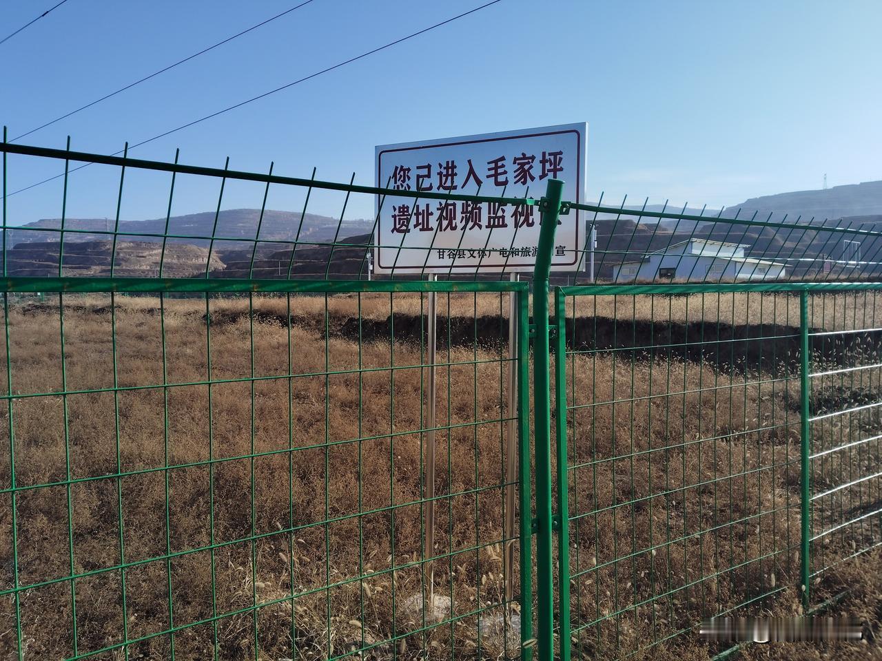 甘谷毛家坪遗址,就在今磐安镇渭河南岸的台地上。毛家坪村被称为永宁古镇,是北宋著名的博马厂,也在半山腰。进入“永宁古镇”,沿一条土路走500米左右,就看到铁丝网护着地毛家坪遗址。可惜的是,那个挖出秦国战车的大炕上,却修了一间彩钢板房,门锁子,进不去。打电话问“文保责任人”,说有县文物局的通知,才会开门让参观。只好遗憾而回。