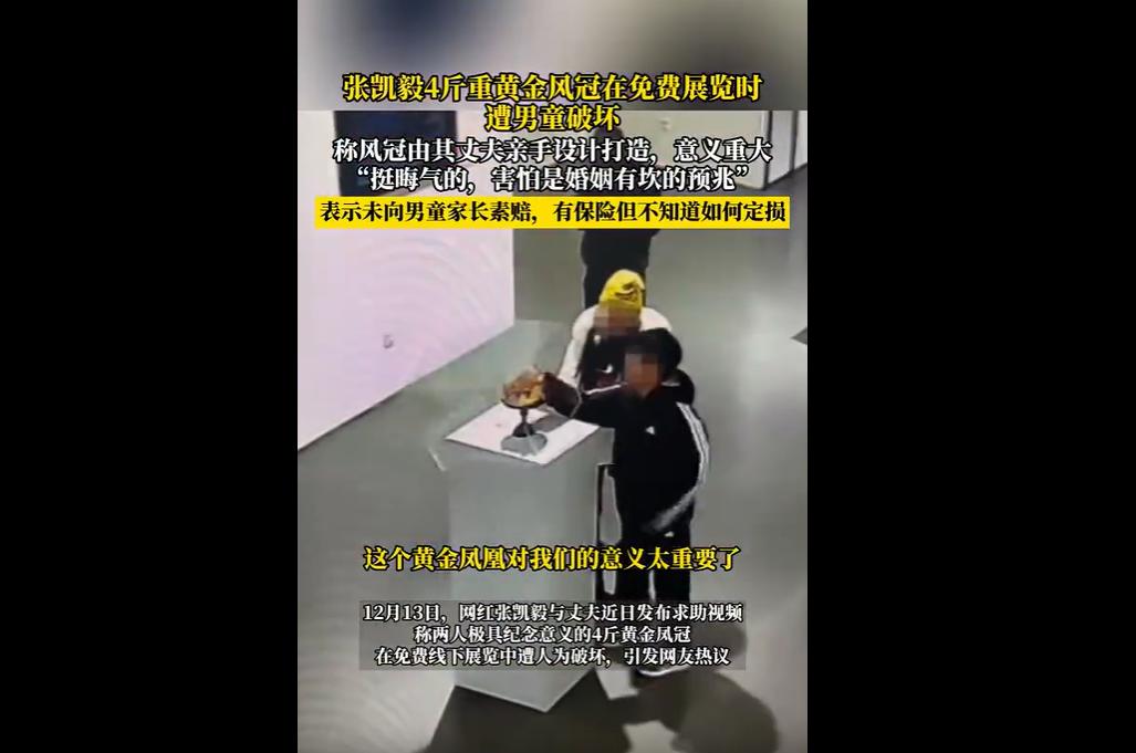 时尚博主张凯毅丈夫耗时 3 个月手工打造的 4 斤黄金凤冠,在免费展览中被一孩童触碰松动的保护罩致掉落损坏。 凤冠价值超百万且具特殊纪念意义,张凯毅因有保险暂未索赔,仅咨询定损。 律师称监护人或担主责,策展方视防护情况定次责。展览方已加强隔离,保险公司追偿与否成焦点。 这事儿看得人又气又可惜! 丈夫亲手做的爱情信物,4 斤黄金堆出来的心意,就被熊孩子一下碰没了原样,换谁不心疼? 最该骂的是孩子家长 —— 眼睁睁看着娃抱着展台反复摸,就不知道管一下? 监护权不是摆设,孩子闯祸就得大人兜底,这是基本常识! 再说说策展方,别拿 “装了保护罩” 当借口,那玩意儿一碰就掉,跟纸糊的有啥区别? 百万级的展品,防护做得还不如菜市场的玻璃柜,这不是糊弄事吗? 真以为有保安盯着就万事大吉? 有人说张凯毅 “有保险就别计较”,这纯属站着说话不腰疼! 这凤冠是用钱买不来的情感寄托,就算修好了也不是原来的样子。 法律上监护人主责跑不了,策展方的失职也不能轻饶。 真该借着这事给所有人敲警钟:看展守规矩是底线,家长管好孩子是本分,主办方护好展品是责任,少一样都得吃教训!