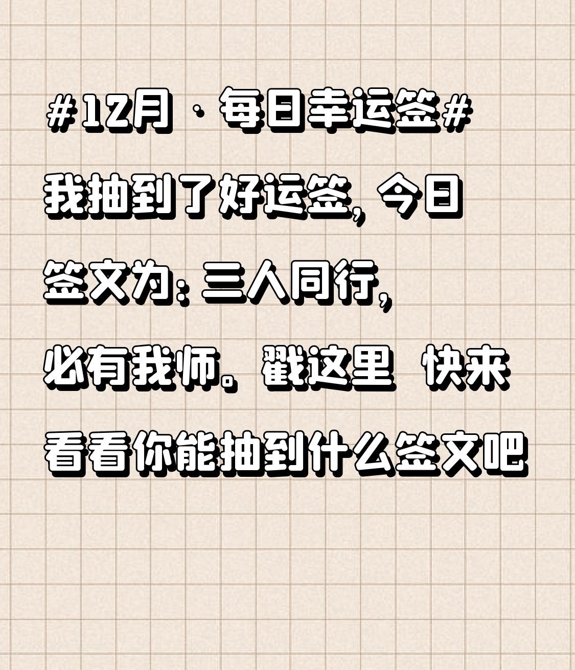 12月·每日幸运签 12月每日幸运签打卡,我抽到了“三人同行,必有我师”的好运签。这签文真的太妙了,让我想起刷头条时,评论区那些观点犀利的大神,创作者主页用心分享的宝藏博主,他们随便一句话、一个建议里都藏着智慧。 生活中也是这样,同行的人各有所长。有的朋友擅长记录生活,把日常过得有滋有味;有的精通干货输出,知识储备超丰富;还有的总能捕捉小确幸,心态特别好。保持谦逊,多向他人学习,每一次相遇都是成长的机会。大家都来抽抽看,说不定也有好运降临!