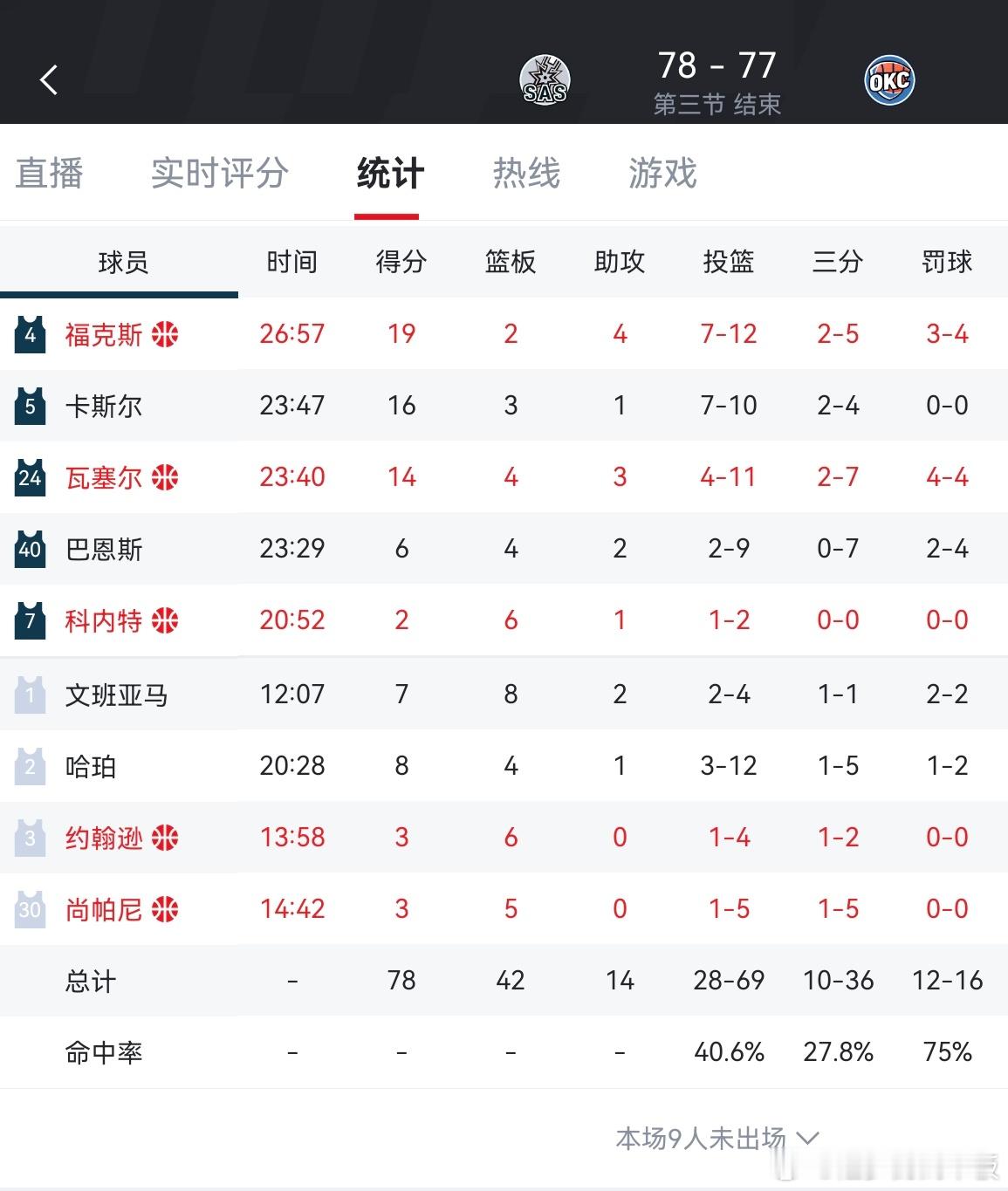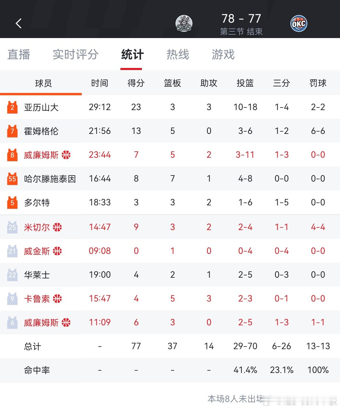 三节结束,马刺领先雷霆1分马刺vs雷霆