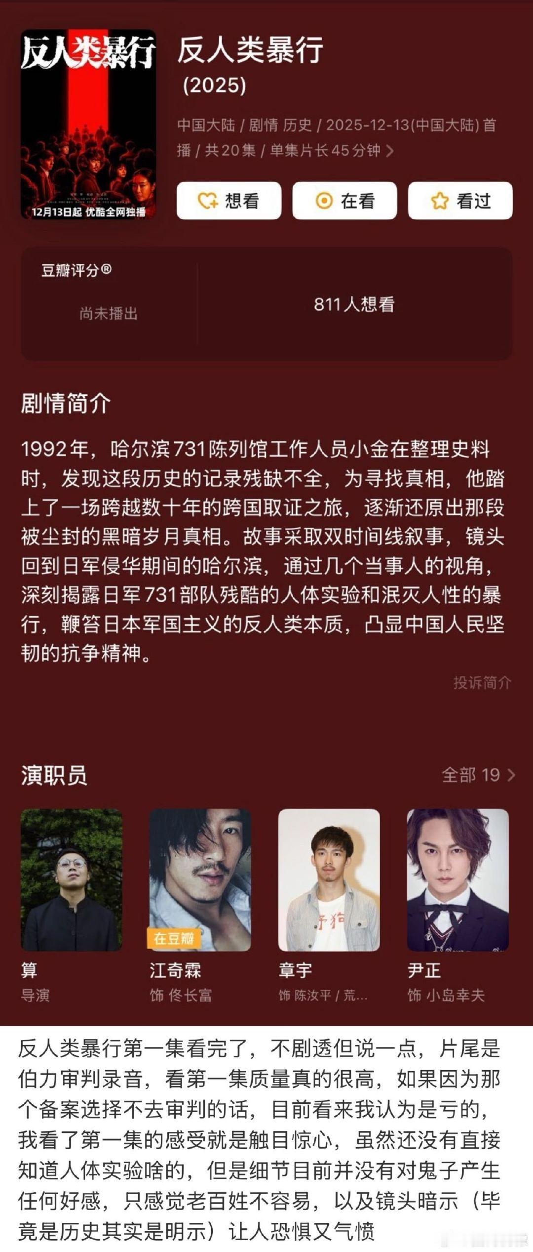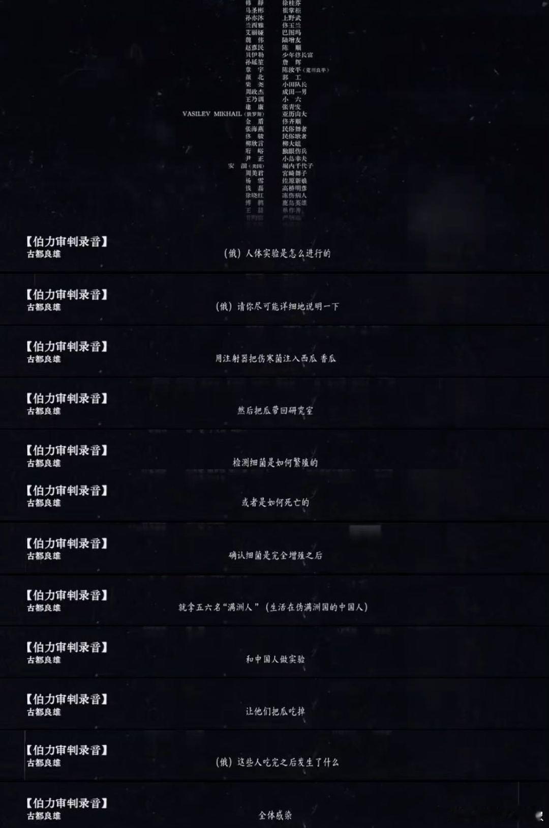 反人类暴行片尾 谁被《反人类暴行》的片尾震撼到了?舍弃华丽配乐,直接用伯力审判的真实录音收尾,战犯亲口承认罪行的声音,比任何画面都有冲击力。这是跨越时空的铁证,更是对遇难同胞的告慰,这部作品值得所有人看!反人类暴行