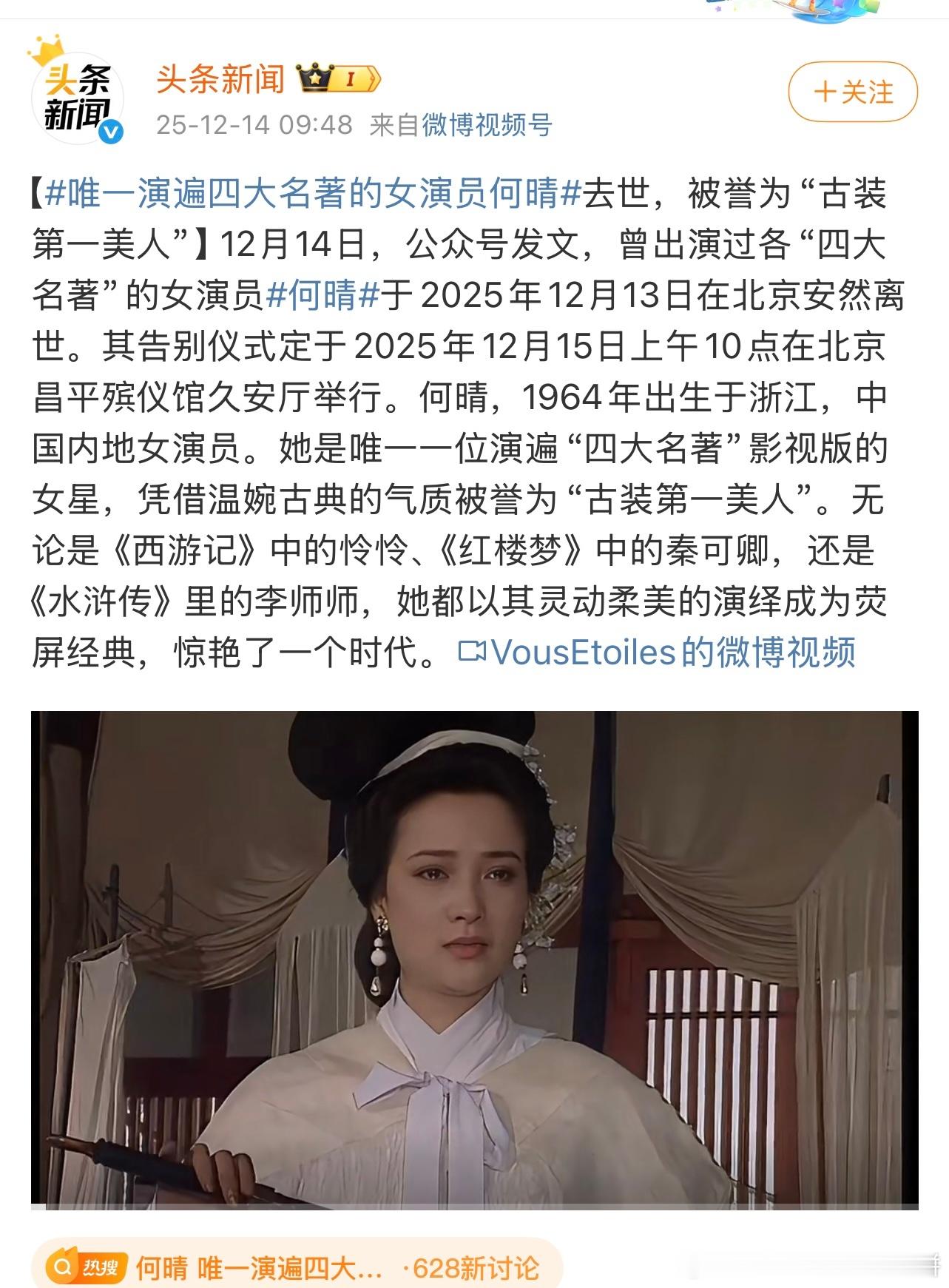 天啊何晴去世了,我印象中的大美人演员何晴被传去世何晴 唯一演遍四大名著的女演员
