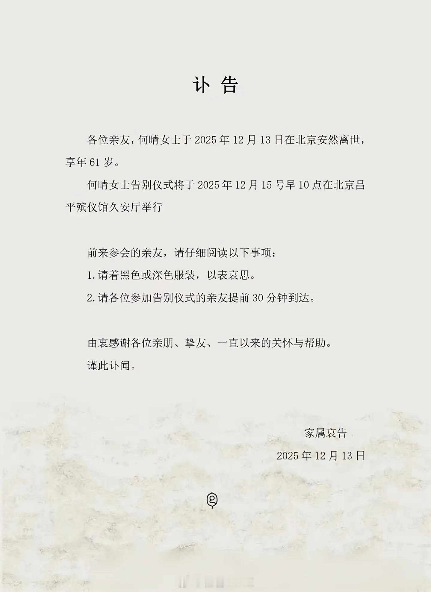 演员何晴去世何晴是唯一演遍四大名著影视剧的女演员,网友评价其表演“融合古典温婉与灵动”,角色跨越少女至成熟女性,情感层次丰富。据多个媒体消息,何晴于2025年12月13日在北京逝世,享年61岁,告别仪式定于12月15日10点在北京昌平殡仪馆举行。 何晴 唯一演遍四大名著的女演员