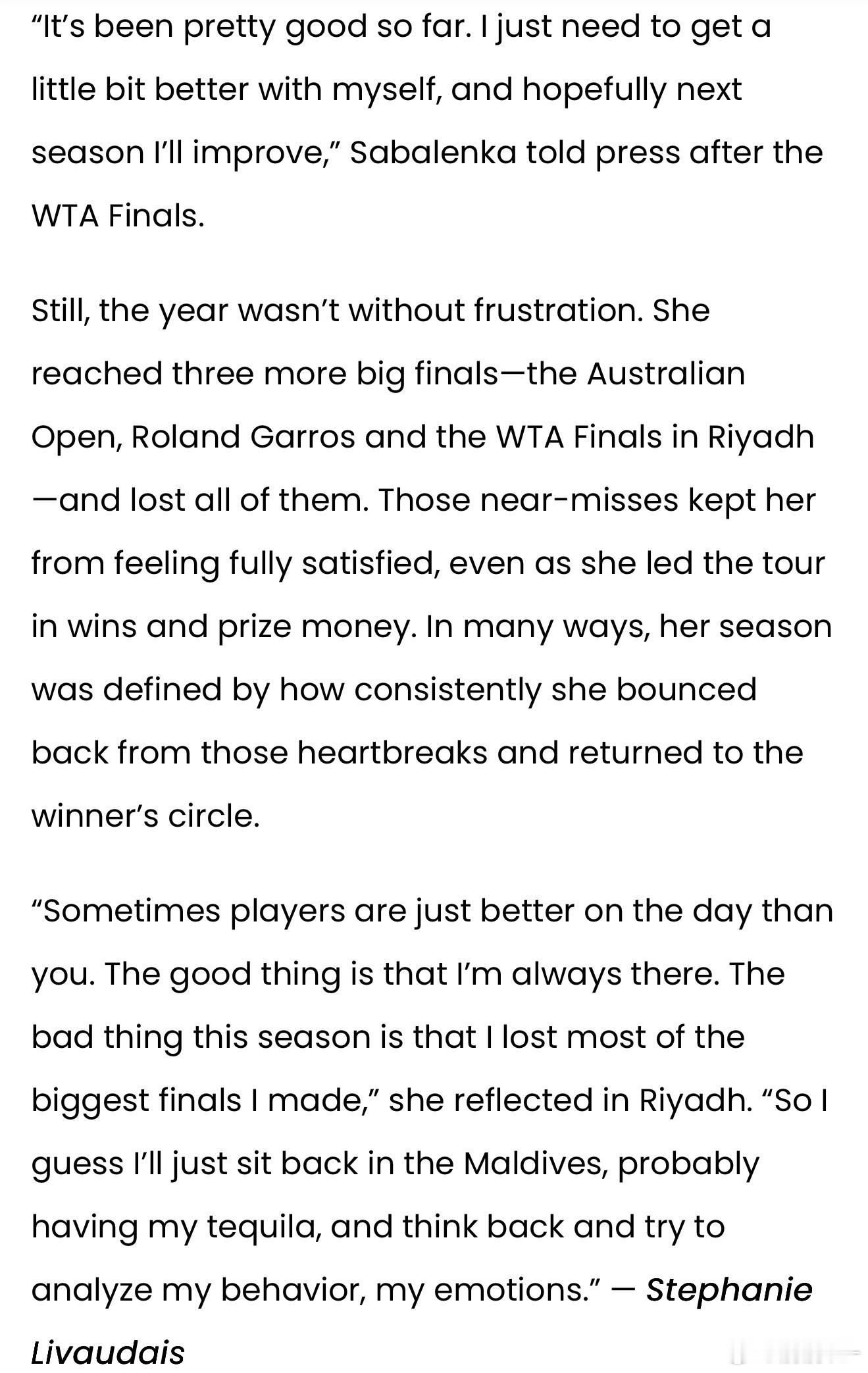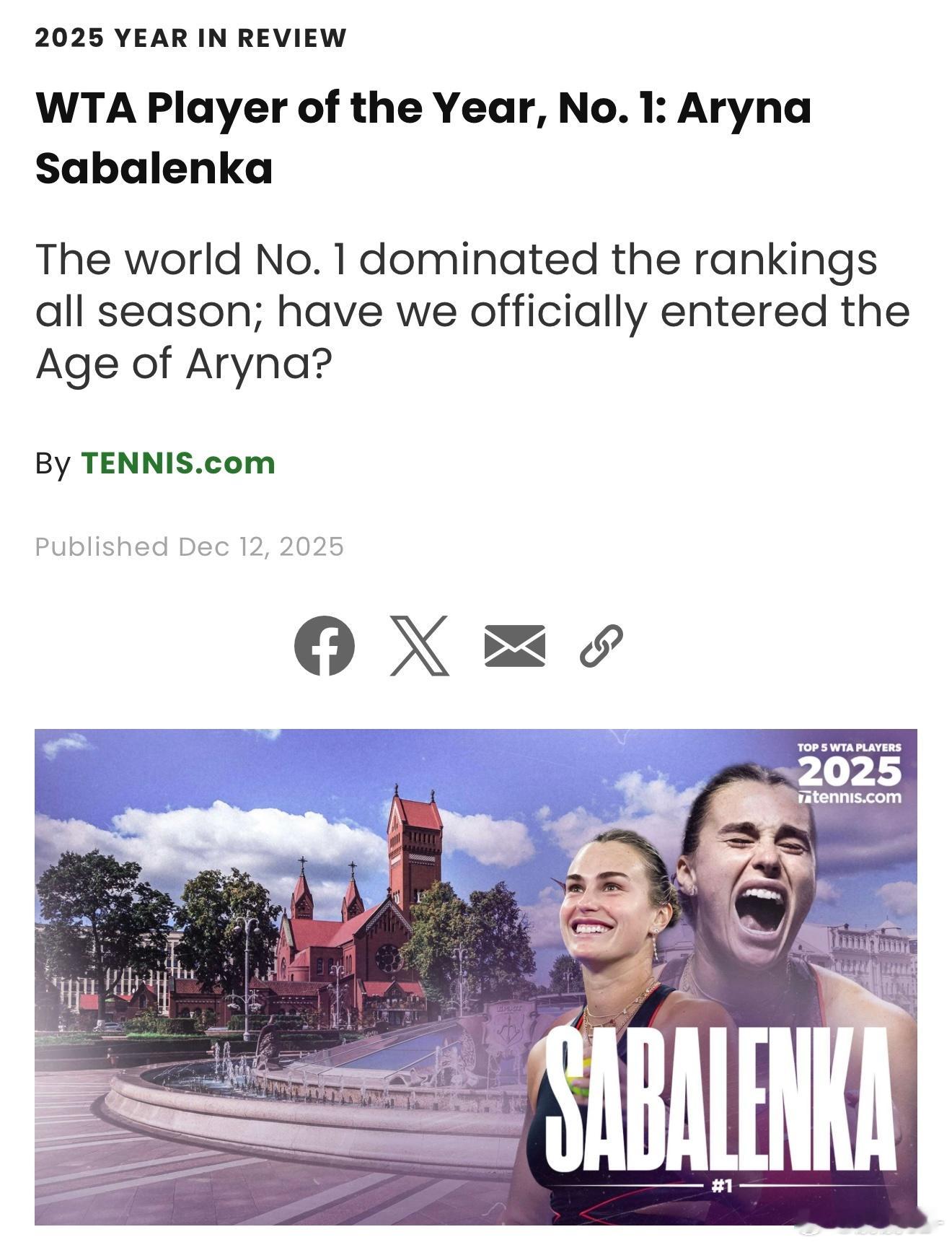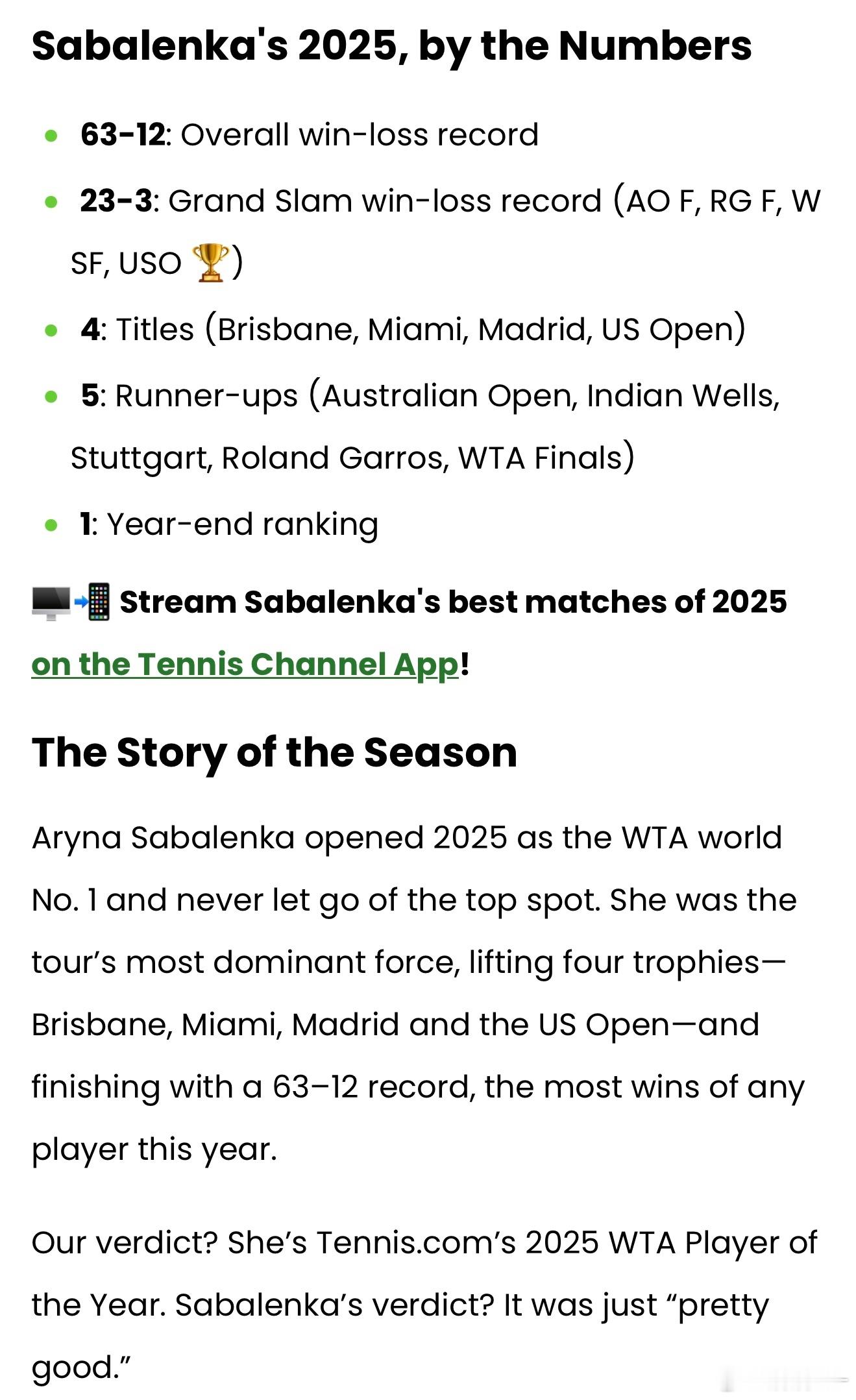 🎾WTA年度最佳球员:阿丽娜·萨巴伦卡🏆这位世界第一在整个赛季都统治着排名榜;我们是否正式进入了“阿丽娜时代”?1️⃣数字解读萨巴伦卡的2025赛季总战绩:63胜12负大满贯战绩:23胜3负(澳网亚军、法网亚军、温网四强、美网冠军)冠军荣誉:4座(布里斯班站、迈阿密站、马德里站、美网)亚军战绩:5次(澳网、印第安维尔斯站、斯图加特站、法网、WTA总决赛)年终排名:第1位2️⃣赛季回顾阿丽娜·萨巴伦卡以WTA世界第一的身份开启2025赛季,全年始终稳坐榜首宝座。她是巡回赛中最具统治力的选手,斩获布里斯班站、迈阿密站、马德里站及美网四座冠军奖杯,以63胜12负的战绩收官,成为本赛季胜场数最多的球员。我们的评价?她当选《网球网》2025年度WTA最佳球员。而萨巴伦卡自己的评价?不过是“还算不错”而已。“到目前为止,本赛季的表现还算不错。我只需要在自身状态上再精进一点,希望下个赛季能取得进步。”萨巴伦卡在WTA总决赛后接受媒体采访时表示。尽管如此,这一年也并非毫无遗憾。她又闯入了三项重要赛事的决赛——澳大利亚网球公开赛、法国网球公开赛以及利雅得WTA总决赛,却悉数落败。即便她本赛季的胜场数和奖金数均位居巡回赛榜首,这些“功亏一篑”的经历仍让她无法完全满意。从很多方面来说,本赛季的她,正因能始终从这些令人心碎的失利中重整旗鼓、重返冠军领奖台,才更显不凡。“有时候对手当天的状态就是比你好。好在我总能跻身决赛舞台,但本赛季遗憾的是,我在闯入的多数重要决赛中都未能夺冠。”她在利雅得复盘时说道,“所以我打算去马尔代夫放松一下,或许会喝着龙舌兰,回顾这一年的经历,好好分析自己的赛场表现和心态起伏。”网球网球talking大会