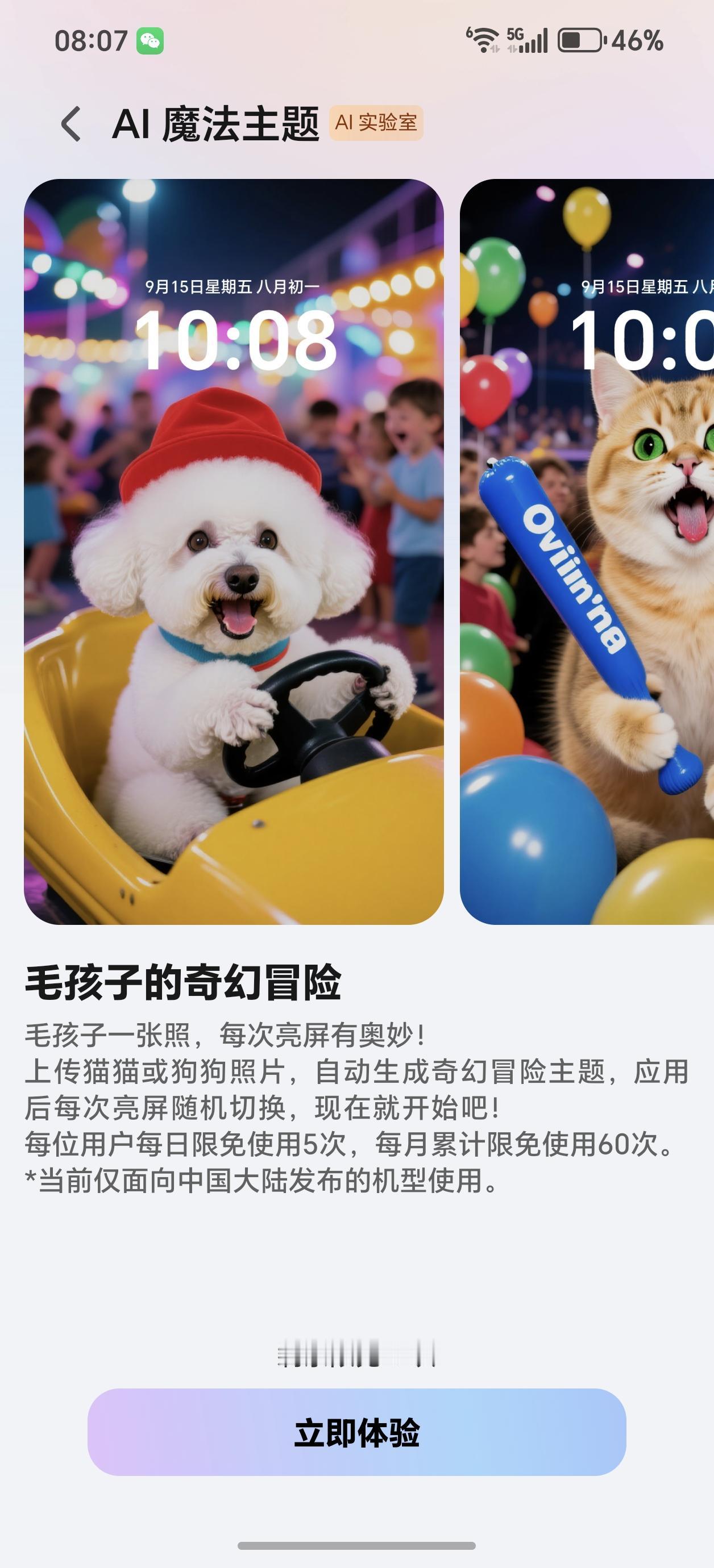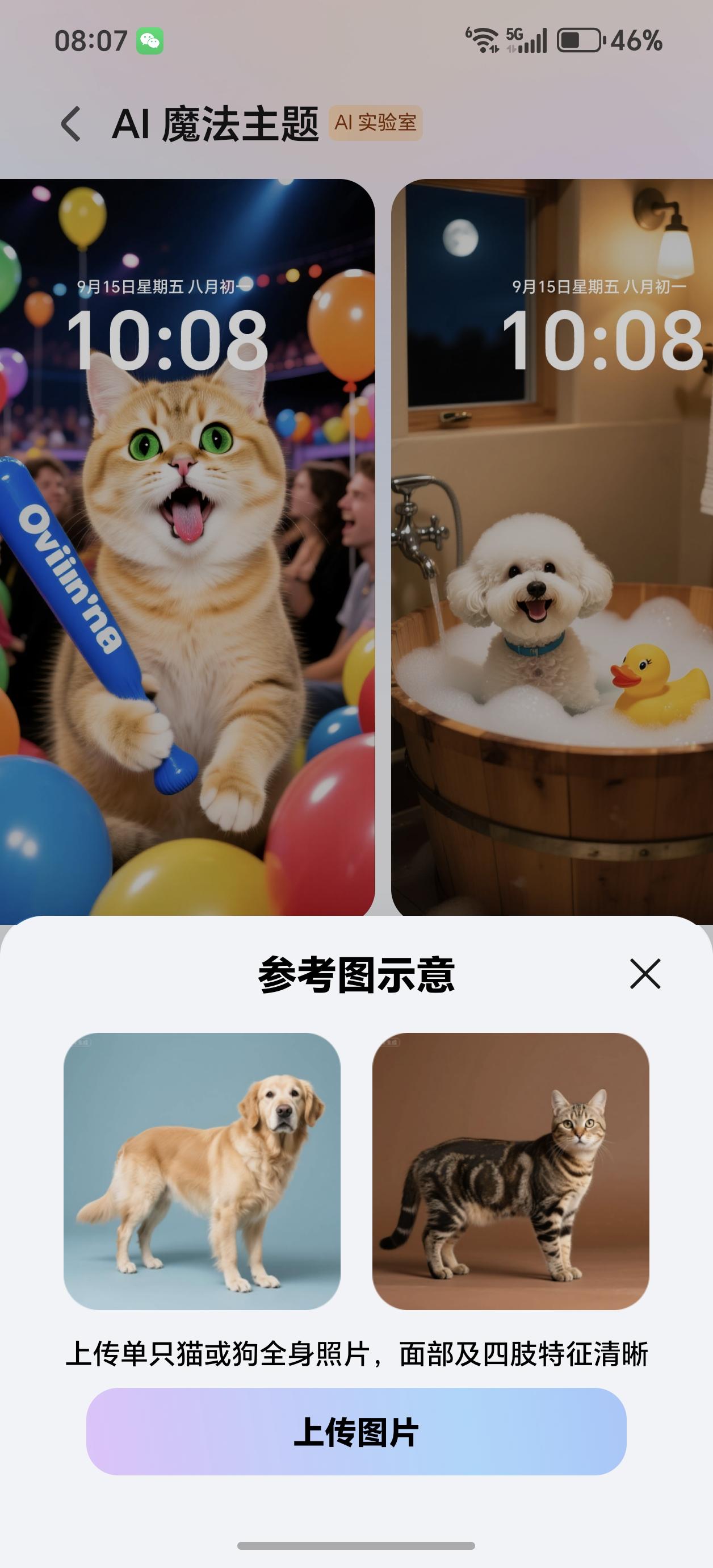 在线等!上午我打开荣耀主题,看到官方实验室推荐AI魔法主题一款叫《毛孩子的奇幻冒险》,觉得蛮有趣,便想自制同款个性化主题。翻遍图库却没找到合适的猫狗猫狗照片,麻烦大家分享一张给我,谢谢