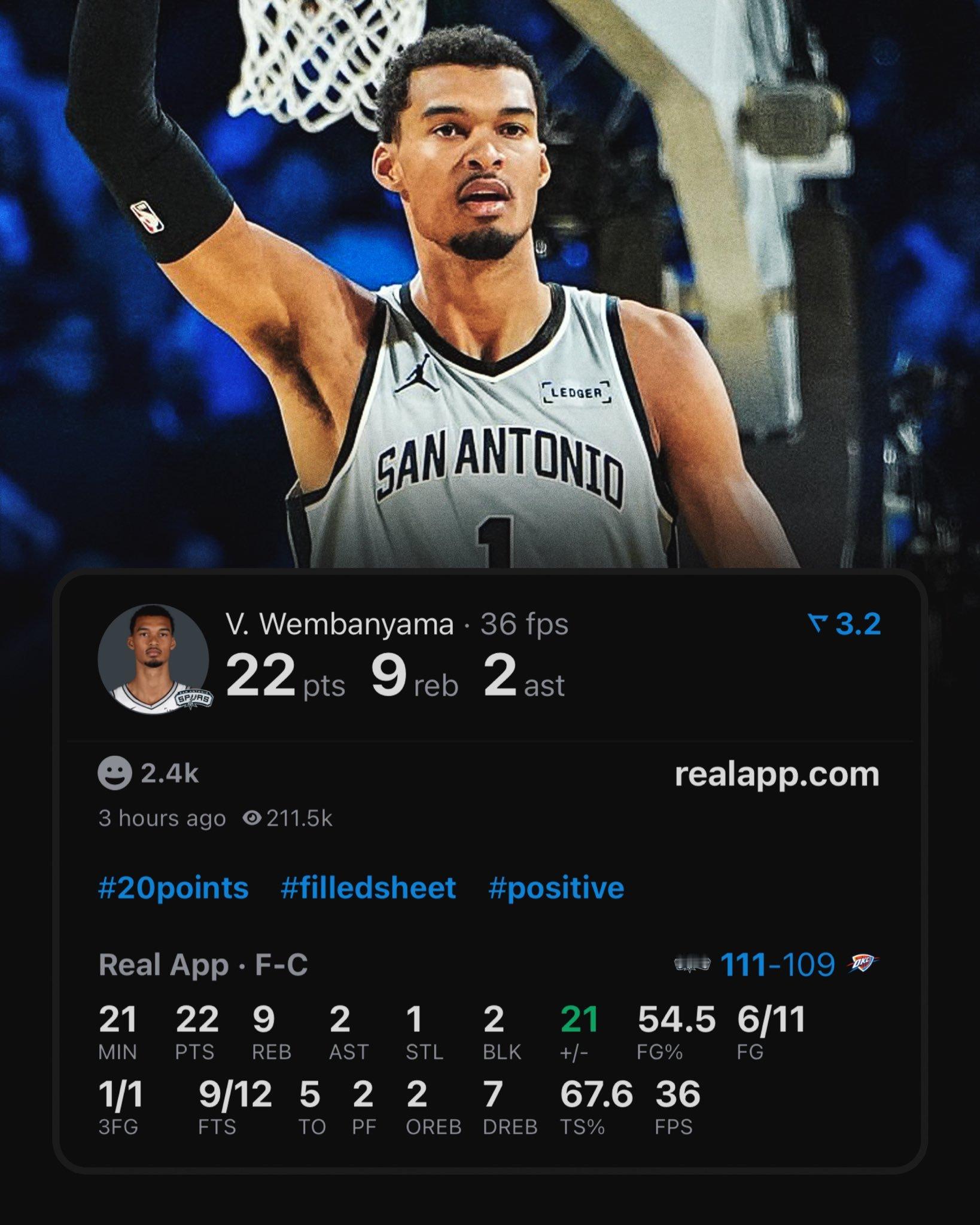 文班亚马时隔12场比赛复出,带着20min左右的出场时间限制替补出战,拿到22分9篮板2助攻1断2帽,末节15分!在场20分39秒帮助马刺赢了21分,带队完成16分逆转!终结雷霆16连胜!米奇带领的马刺教练组做出了精密的轮换计划,最终在文班的带领下改变了比赛。而除了文班,瓦塞尔+卡斯尔+福克斯投出21中9的三分(马刺其余人是21中4,雷霆全队37中9),同时马刺也造出了雷霆15次失误,利用这些失误拿了26分,甚至比雷霆利用失误得分还高出1分。他们四人20+,一次次面对雷霆起势,最后时刻拿出了对SGA坚实的防守。这是一场预示着新时代的对决,马刺终结了雷霆的连胜,也击碎了雷霆又一次对杯赛冠军的冲击。2015-16赛季的勇士直到第31场比赛才吃到常规赛第二败,雷霆要想冲击纪录,后续得多踩一踩油门了。马刺vs雷霆NBA杯半决赛
