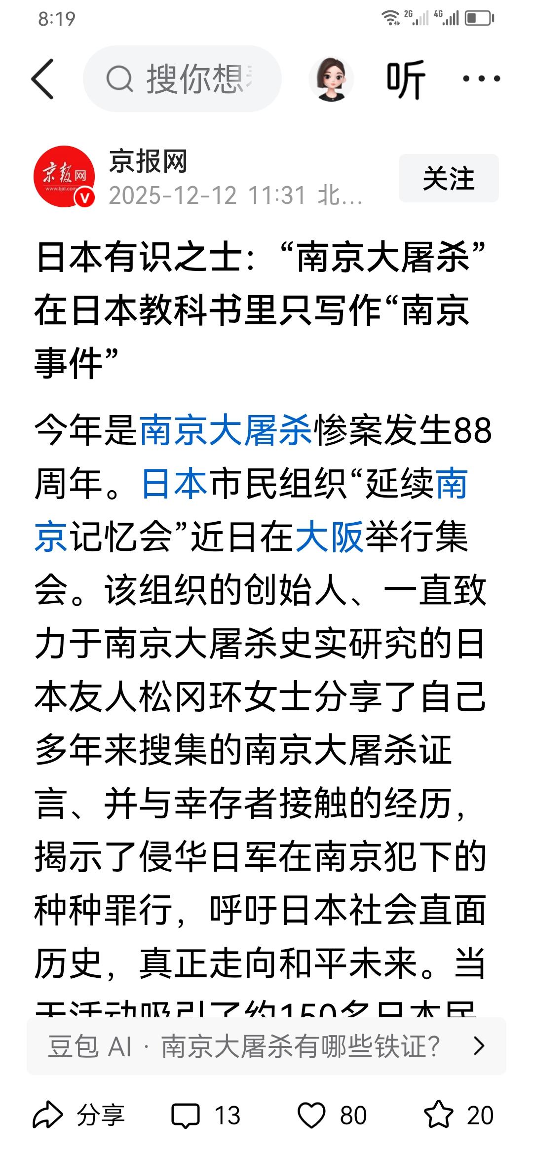 日本也有清醒人,只是太少。 每年此时,邀请民间日本人士举办见证会。 的确,那怕高市早苗有一点反悔,也不至于发出日本危机存亡的话。 严重影响日本经济。 长期以往,日本日益被孤立,而美国也靠不住。 了解历史,是日本人要补的课。 相反,日本的学生在校学不到南京大屠杀的事件,日本防卫大学的学生每年参拜其靖国神社。 日本的一些博物馆不断减少去掉南京大屠杀的内容。 不断美化其侵略史,确令人担心。 日本公众被蒙蔽。