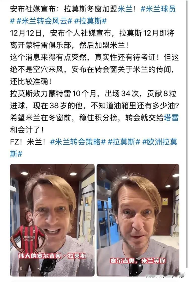 拉莫斯!安布罗西尼说米兰冬季窗口二选一选择的是拉莫斯。我个人肯定是希望来的是迪亚哥席尔瓦,但拉莫斯也行。半个赛季单线作战,无论作为主力或者是轮换,拉莫斯的实力还是可以帮到球队的,最重要的是拉莫斯不可能惯着意甲一些球队球员,咱们球员太老实了,需要来个拉莫斯这样的。 拉莫斯之前半个赛季在墨西哥表现还是很优秀的,特别是攻防两端的进攻端,看着拉莫斯的数据不知道的以为他在墨西哥踢的是中锋呢,比我们前锋进球都多,个人想法拉莫斯的经验与拉莫斯的气质能为米兰带来不一样的元素,他加盟米兰不会有不好的影响。 安布罗西尼说他之前就知道米兰的选择,拉莫斯会加盟米兰。其实之前拉莫斯就差点加盟米兰,但是那年我们有点混乱,今年来也行,个人觉得拉莫斯还有油,至少半个赛季问题不大,最重要的是拉莫斯来米兰是来圆梦的,作为马尔蒂尼的迷弟他加盟米兰就是抱着朝圣米兰偶像顺便拿个冠军,从这个角度考虑拉莫斯来不是坏事。