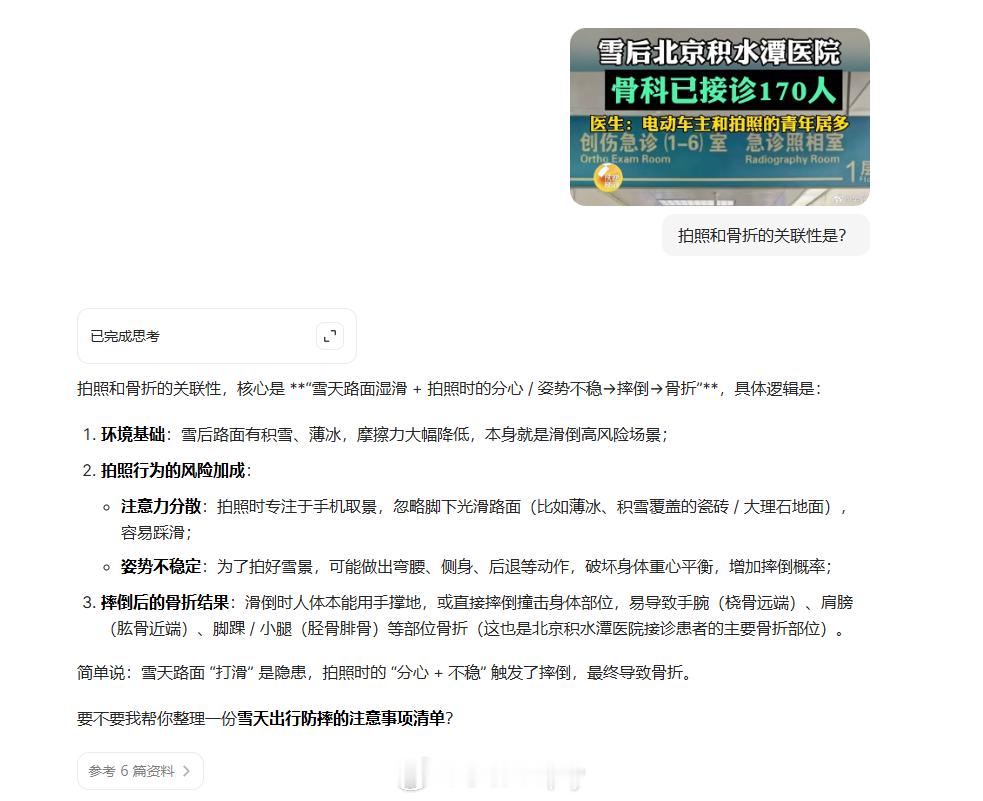 成都人看到这条简直是懵的啊……甚至看到AI的回答我都很难理解。雪天,拍照——导致骨折……