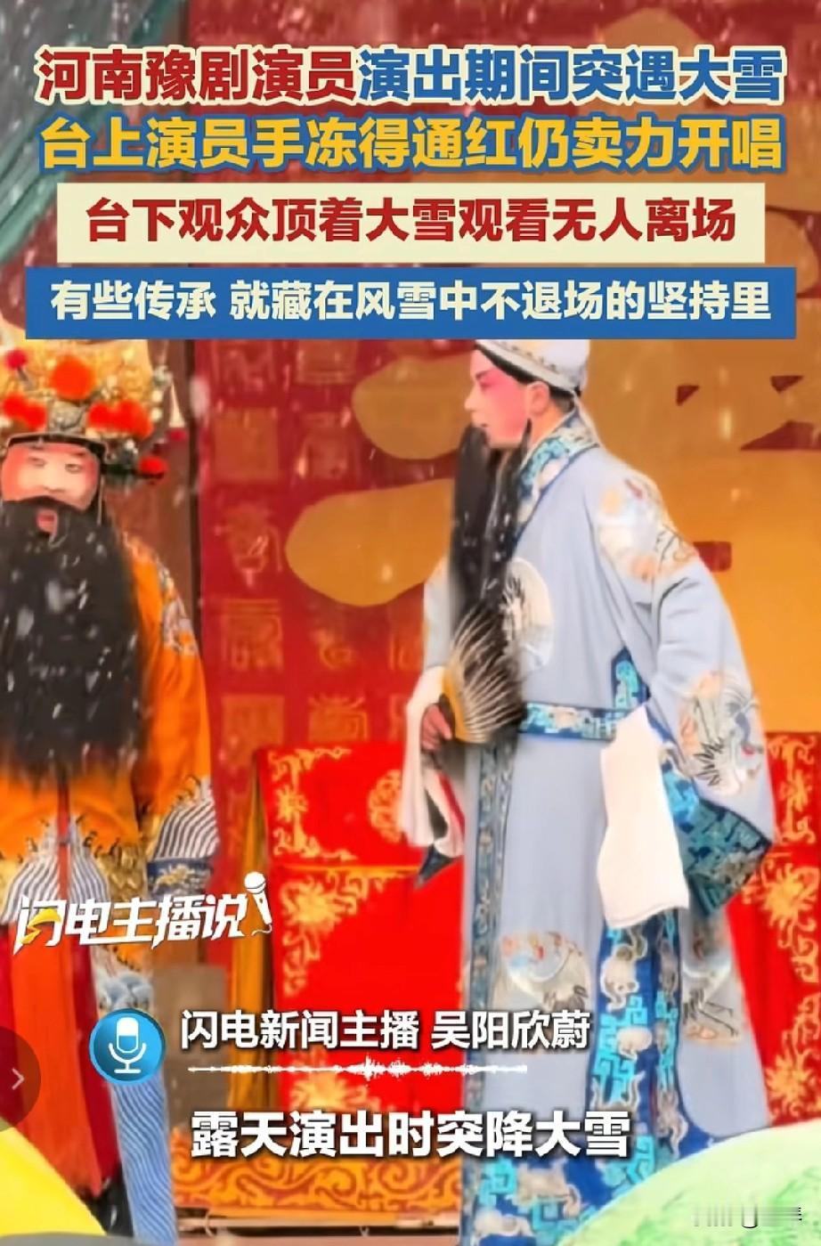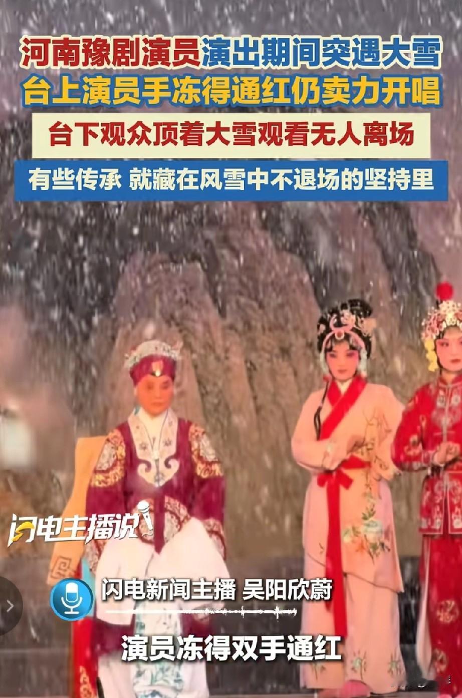 河南豫剧有多火,看看这篇报道就知道。[灵光一闪] 顶风雪的戏台,看豫剧多传神,这场双向奔赴看哭了所有喜欢豫剧的人。 当漫天大雪席卷露天戏台,河南豫剧演员的双手早已冻得通红,可婉转的唱腔、标准的身段,却没有半分走样;台下的观众顶着纷飞的雪花,从开场到落幕,无一人提前离场。 寒雪可以冰封指尖,却封不住豫剧演员对艺术的敬畏与执着。他们在风雪里开嗓,将一腔热忱揉进每一句唱词、每一个身段,用最朴实的坚守,守护着豫剧的魂。 而观众的不离不弃,更是对这份坚守最温暖的回应。雪花落在肩头,掌声响在耳畔,台上台下的这份默契,不是简单的观演关系,而是对传统艺术最深情的告白。 有些传承,从不在金碧辉煌的殿堂里,而在风雪中不曾退场的坚持里。这一方被大雪覆盖的戏台,藏着豫剧生生不息的密码,也藏着中国人对传统文化刻在骨子里的热爱与守护。 晒图笔记大赛艺术 河南 豫剧
