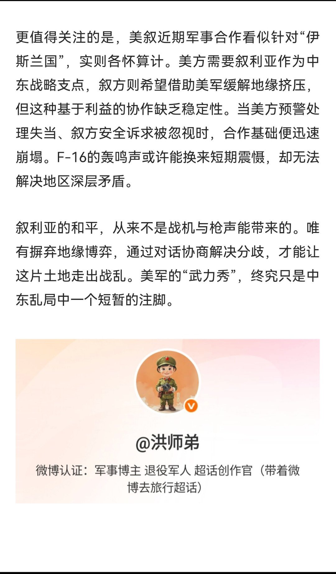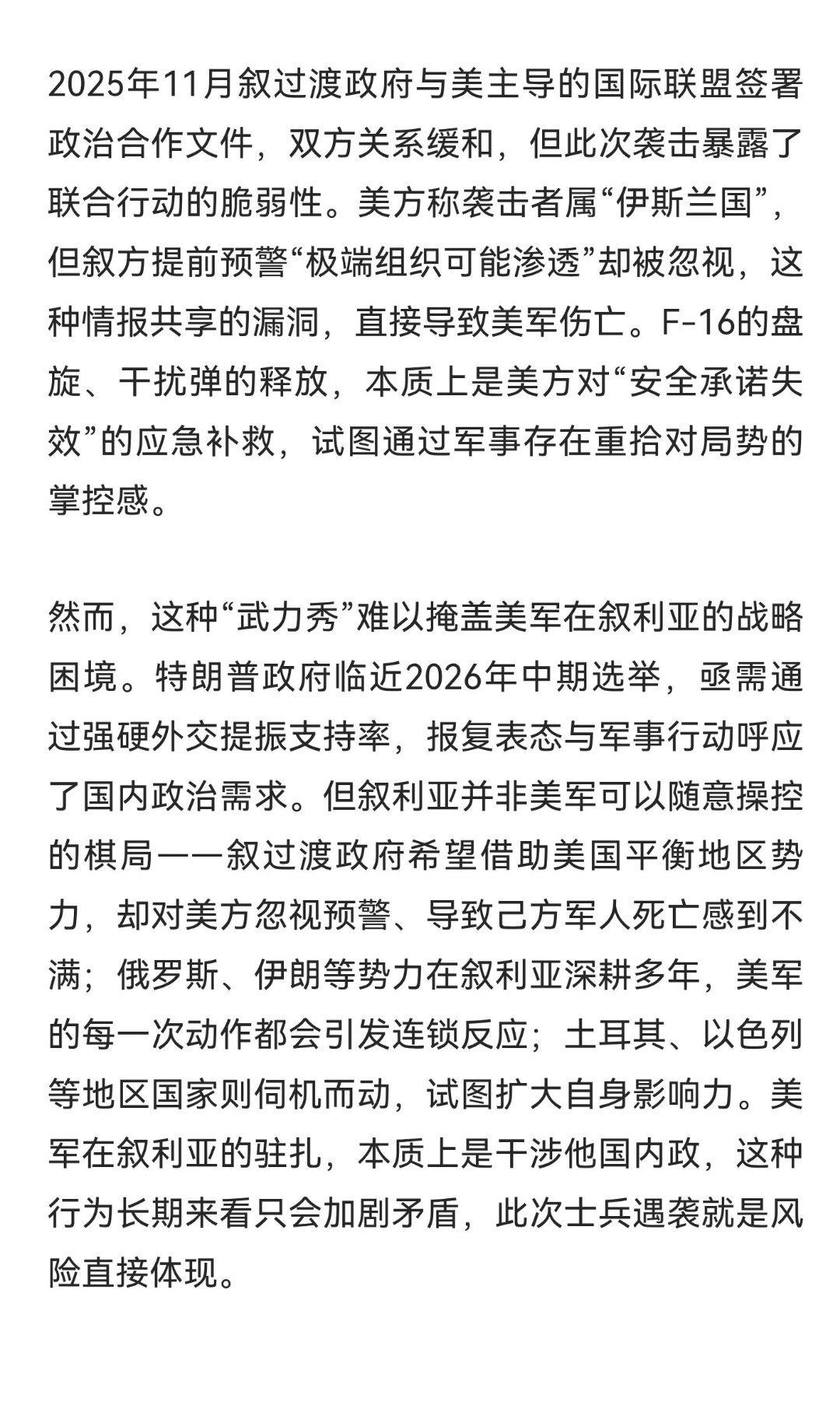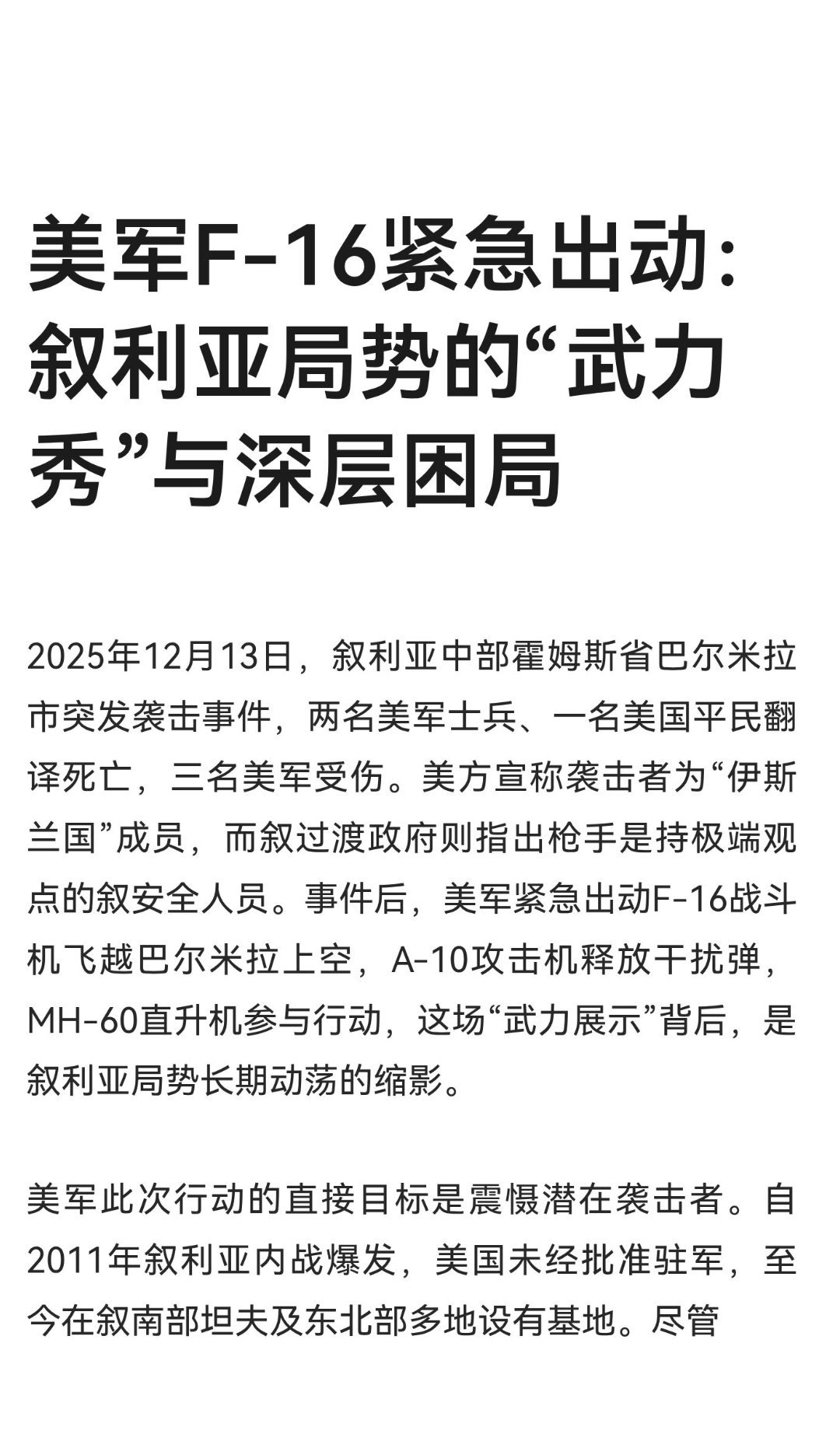 | 2025年12月13日,叙利亚中部霍姆斯省巴尔米拉市突发袭击事件,两名美军士兵、一名美国平民翻译死亡,三名美军受伤。美方宣称袭击者为“伊斯兰国”成员,而叙过渡政府则指出枪手是持极端观点的叙安全人员。事件后,美军紧急出动F-16战斗机飞越巴尔米拉上空,A-10攻击机释放干扰弹,MH-60直升机参与行动,这场“武力展示”背后,是叙利亚局势长期动荡的缩影。自2011年叙利亚内战爆发,美国未经批准驻军,至今在叙南部坦夫及东北部多地设有基地。尽管2025年11月叙过渡政府与美主导的国际联盟签署政治合作文件,双方关系缓和,但此次袭击暴露了联合行动的脆弱性。美方称袭击者属“伊斯兰国”,但叙方提前预警“极端组织可能渗透”却被忽视,这种情报共享的漏洞,直接导致美军伤亡。F-16的盘旋、干扰弹的释放,本质上是美方对“安全承诺失效”的应急补救,试图通过军事存在重拾对局势的掌控感。特朗普政府临近2026年中期选举,亟需通过强硬外交提振支持率,报复表态与军事行动呼应了国内政治需求。但叙利亚并非美军可以随意操控的棋局——叙过渡政府希望借助美国平衡地区势力,却对美方忽视预警、导致己方军人死亡感到不满;俄罗斯、伊朗等势力在叙利亚深耕多年,美军的每一次动作都会引发连锁反应;土耳其、以色列等地区国家则伺机而动,试图扩大自身影响力。美军在叙利亚的驻扎,本质上是干涉他国内政,这种行为长期来看只会加剧矛盾,此次士兵遇袭就是风险直接体现。更值得关注的是,美叙近期军事合作看似针对“伊斯兰国”,实则各怀算计。美方需要叙利亚作为中东战略支点,叙方则希望借助美军缓解地缘挤压,但这种基于利益的协作缺乏稳定性。当美方预警处理失当、叙方安全诉求被忽视时,合作基础便迅速崩塌。F-16的轰鸣声或许能换来短期震慑,却无法解决地区深层矛盾。叙利亚的和平,从来不是战机与枪声能带来的。唯有摒弃地缘博弈,通过对话协商解决分歧,才能让这片土地走出战乱。美军的“武力秀”,终究只是中东乱局中一个短暂的注脚。