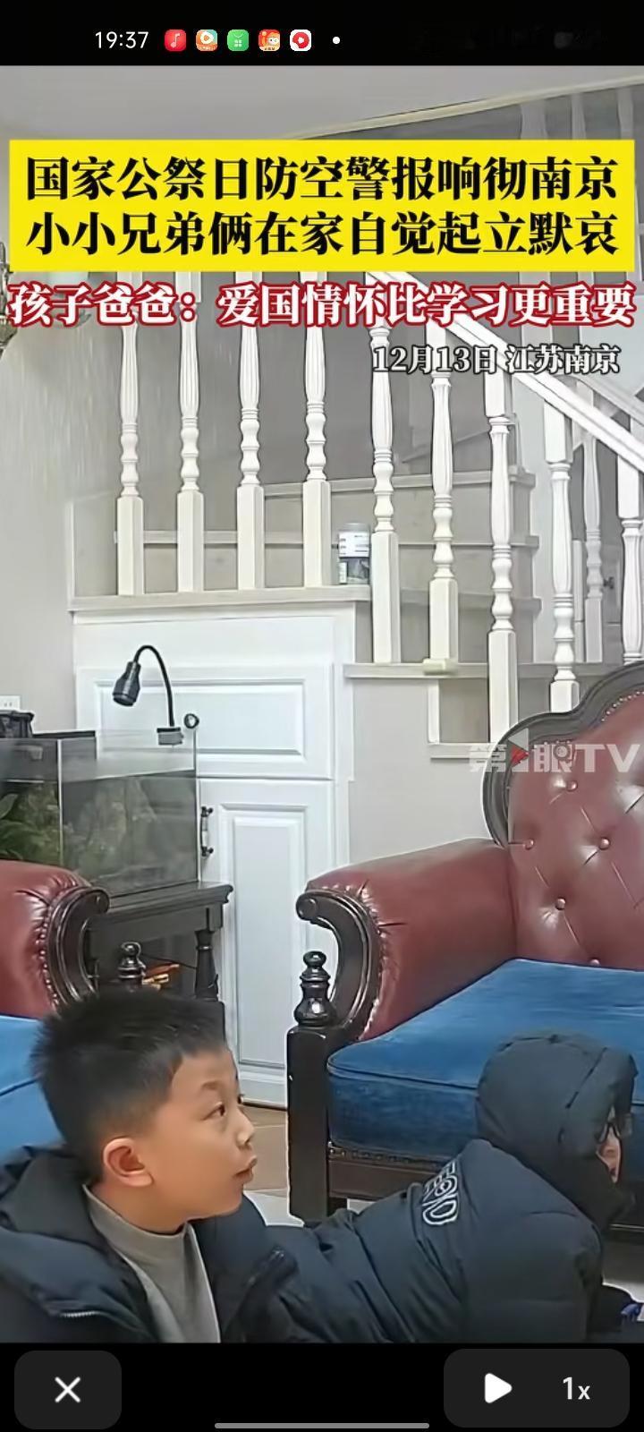 12月13日,江苏南京。国家公祭日防空警报响彻南京,兄弟俩在家自觉起立默哀。 孩子爸爸许先生称,当天和他妈妈外出有事,兄弟俩因为周末两人独自在家,有时不放心会回看家里的监控,还是很欣慰的,也替他们两个感到骄傲,也感谢学校对这方面的教育和普及