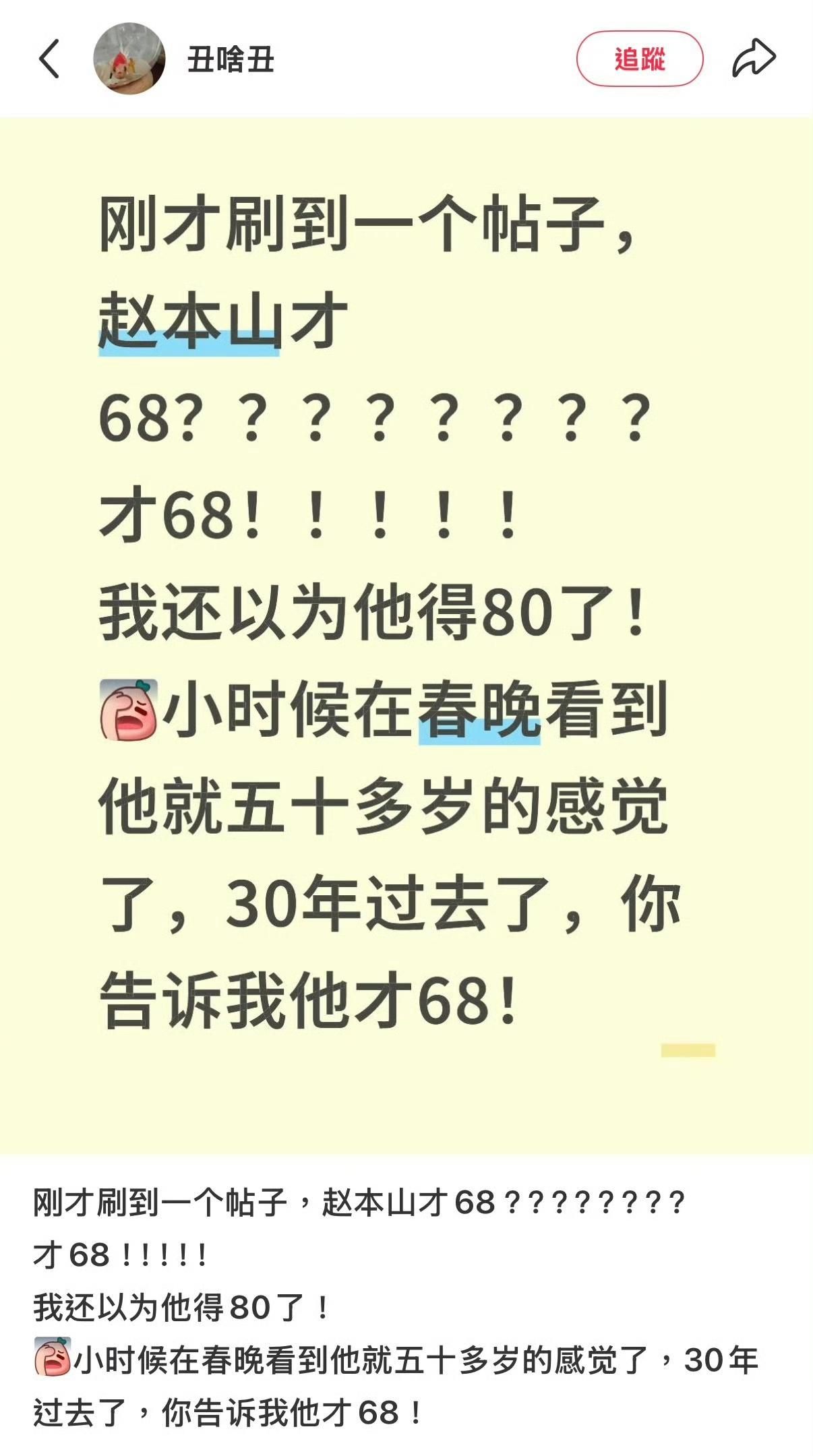 啊??赵本山好年轻啊! 在我这跟长相没太大关系,就是我感觉他十几年前就因为身体原因不上春晚了,我以为那时候就已经七十多了坚持不住了,没想到现在才68!