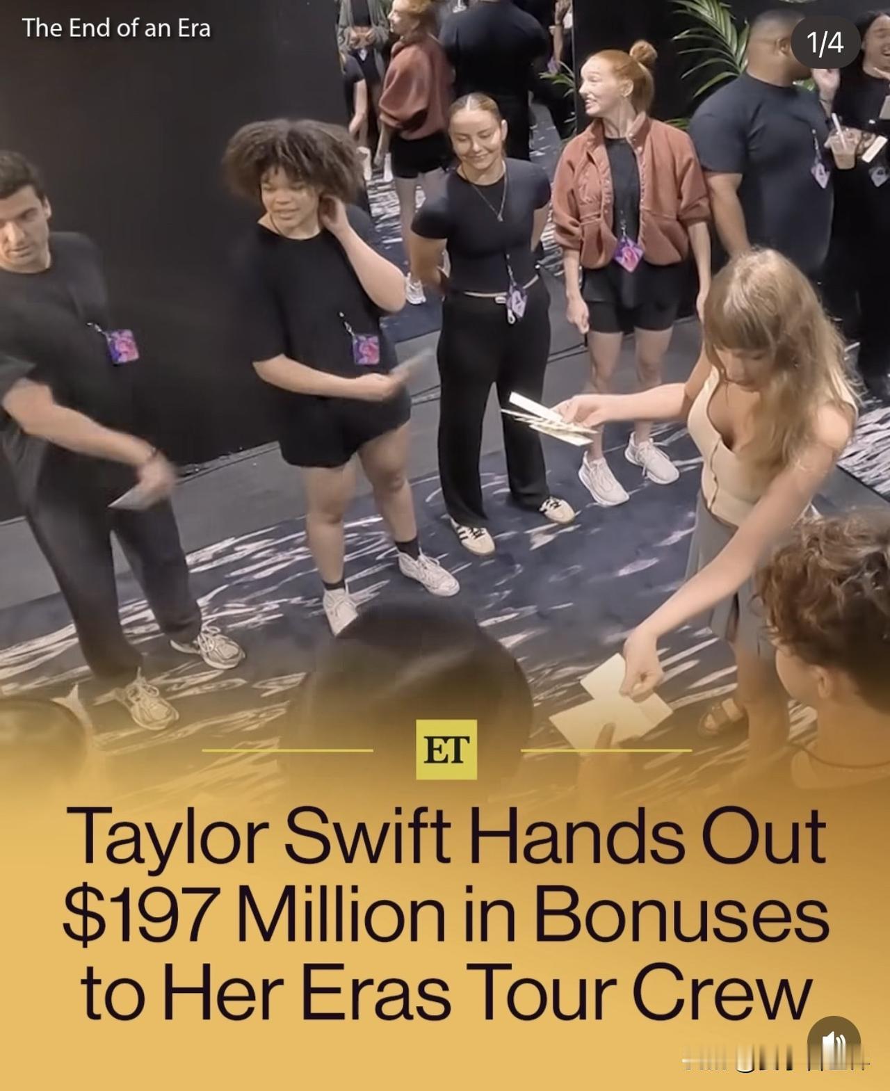 聖誕節來臨之際,霉霉為她的團隊發放了1.97億美元(約14億人民幣)的全球巡迴演出獎金!🎄💰 It pays to roll with Taylor Swift. 'The End of an Era' captured the moment Taylor surprised her Eras Tour team with bonus checks — and judging by their reactions, the amounts were no joke. (Even if they were bleeped out). What we do know: Taylor handed out $197 million in bonuses across the entire crew, including six-figure checks for the truck drivers who kept the tour moving. Her handwritten letter said: "We've traveled the world like we set out to do. We've dazzled the crowds, but we've missed family too. My full gratitude doesn't come from a bank, but here's [bonus check amount] dollars just to say thanks. Love, Taylor."