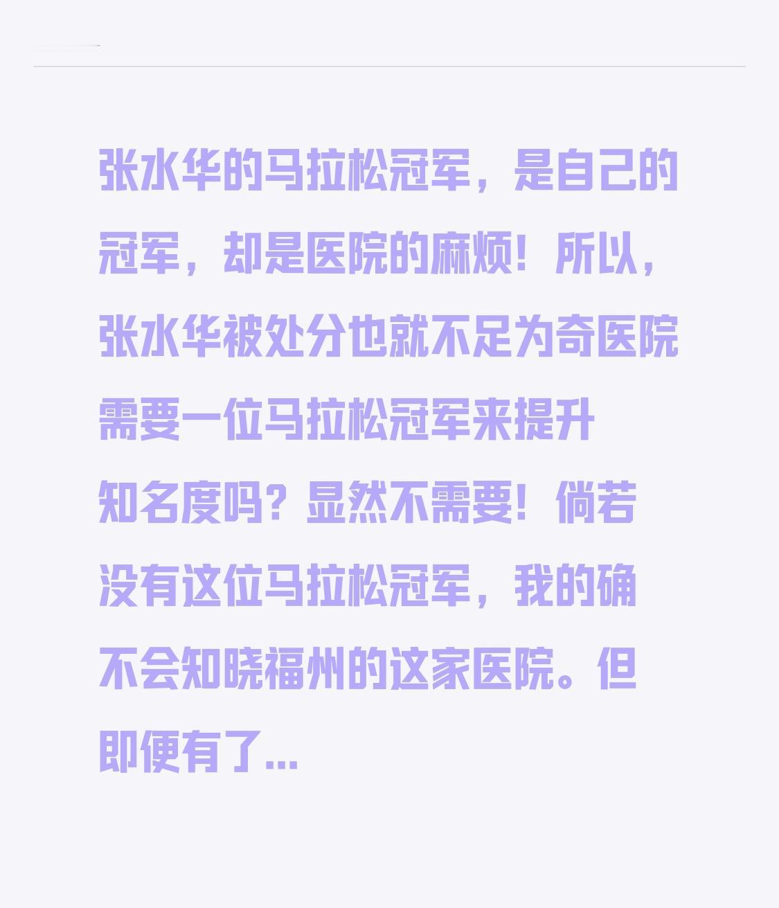 马拉松冠军,是张水华自己的冠军,却是医院的麻烦!所以,张水华被处分也就不足为奇了! 医院需要一位马拉松冠军来提升知名度吗?显然不需要! 倘若没有这位马拉松冠军,我的确不会知晓福州的这家医院。但即便有了这位冠军,我也不会因此就选择前往福州的这家医院就医。没有张水华,福州当地百姓该去这家医院看病的,依旧会去;外地患者该不来的,还是不会来。所以,这位马拉松冠军对医院而言毫无意义,不过是徒增了些麻烦罢了!