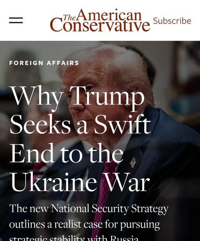 《美国保守派》:特朗普为何希望尽快结束乌克兰战争 12月9日,美国昆西负责任治理研究所研究员埃尔达尔·马梅多夫在《美国保守派》杂志发文称,美国新国家安全战略清楚地证明,特朗普提出的“乌克兰28点和平计划”并非偏离常规,他还指出,这一计划也不是“俄罗斯外交官对维特科夫特使进行不由自主操控的结果—— 埃尔达尔·马梅多夫这篇文章直戳要害,说特朗普想赶紧收尾乌克兰这摊子事,不是脑子一热,也不是被莫斯科那边牵着鼻子走。12月4日,白宫刚甩出新版国家安全战略,这文件把美国利益摆在头位,欧洲那块儿得自己扛起防务担子,别老指望华盛顿当冤大头。马梅多夫在《美国保守派》上写,这战略跟特朗普的28点方案一脉相承,核心就是现实主义,别再玩全球警察那套。想想看,美国这些年砸了上万亿在海外,现在资源吃紧,盟友们得醒醒神。 先说说这28点方案啥来头。11月下旬,特朗普团队在白宫敲定初稿,特使史蒂夫·维特科夫特牵头,国务卿马尔科·鲁比奥和贾里德·库什纳也掺和进来。方案一曝光,就炸锅了。基辅得让出克里米亚全境,顿涅茨克和卢甘斯克也得拱手相让,扎波罗热和赫尔松沿战线冻结。乌克兰军队规模限25万人,永久拜拜北约大门,还得拆除部分导弹系统。换来的是北约式安全承诺,但这承诺听着像空头支票。 新国家安全战略里,欧洲章节直指痛点。文件说,美国不再像阿特拉斯扛世界,富裕盟友得自己掏腰包防务。结束乌克兰战火是华盛顿头等大事,免得跟俄罗斯擦枪走火闹到核门槛。战略还抨击欧盟政策拖经济后腿,移民潮和言论管制造成身份危机。北约扩张得刹车,莫斯科早把乌克兰入盟当红线,这跟俄方一拍即合。华盛顿评估,向基辅给铁板钉钉的安全伞风险太大,目标是抽身危机,别添新包袱。马梅多夫点明,这方案不是俄外交官操控维特科夫特的结果,那些说计划“莫斯科造”的论调纯属扯淡。它是美国优先原则的落地,算计清楚了:快速停火挡意外升级,推动欧洲自立门户,止住北约东扩,稳住跟俄罗斯的战略平衡。搁欧洲那边,反应五味杂陈。 马梅多夫的文章剖析,美国资源有限,维系全球霸权玩不动,转而号召欧洲亚太盟友总动员,盯中国崛起。这和平转向听着高大上,其实是实力暂缓的信号,需要歇口气攒劲儿。未来,华盛顿的靶子不光是中国,还包括普京掌舵的俄罗斯。文件里虽说结束战争是核心利益,但对俄没明说对手,欧洲得警醒:华盛顿优先自家后院,西方半球防务加码。欧洲得自掏腰包建防线,别老靠美国买单。战略还敲打欧洲少数派政府压制反对派,言论管制像审查,这话听着像给极右翼递梯子。 这战略对俄罗斯是橄榄枝还是套索?马梅多夫的分析提醒,这调整是大国博弈新阶段,美国休整完,还会冲霸权,俄罗斯和中国都得防着点。和平脆弱,随时复燃。