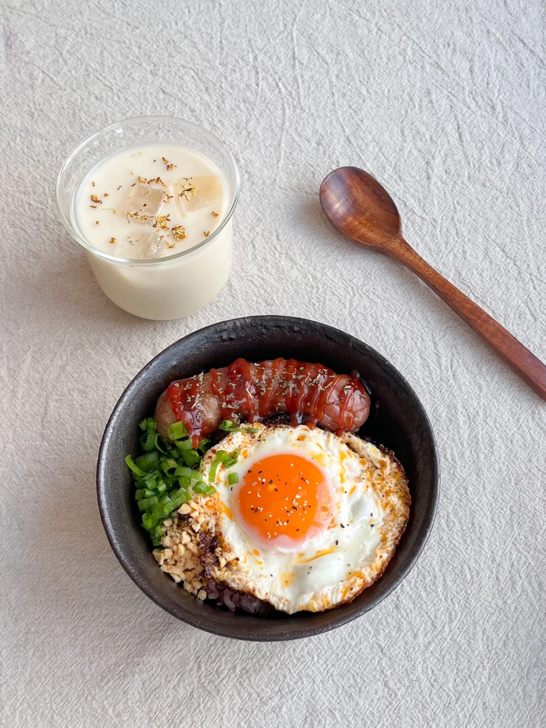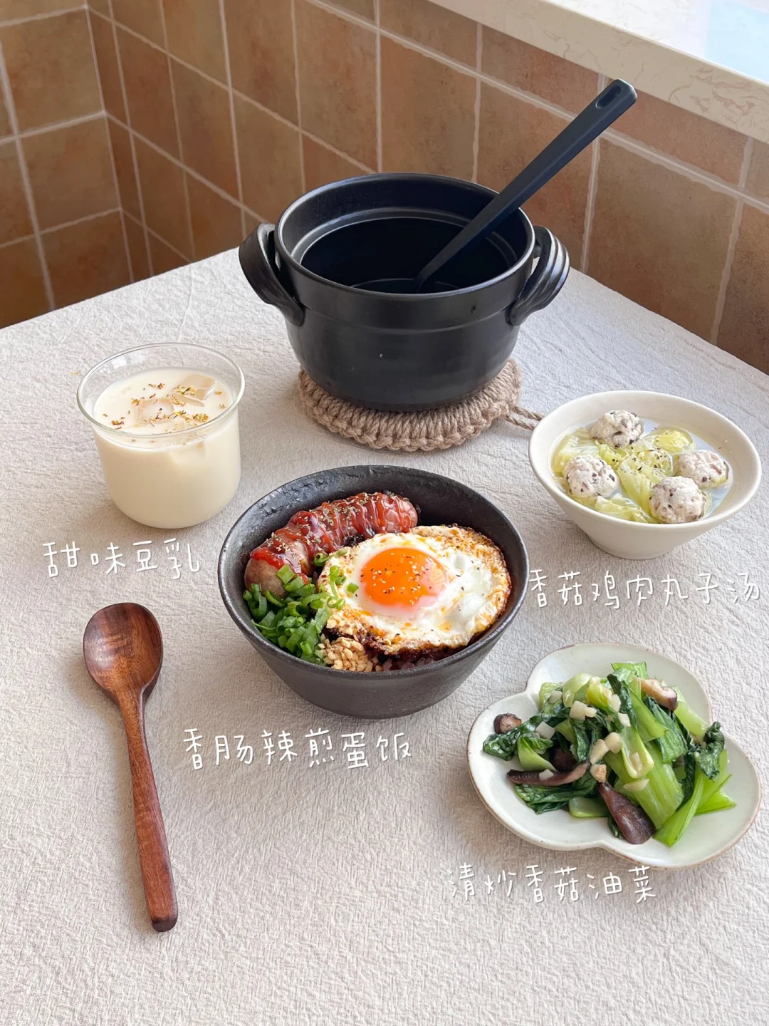 今日午餐: 香肠辣煎蛋饭🍳 卷心菜香菇鸡肉丸子汤🥣 清炒香菇油菜🥬 甜味豆浆🫘 今天起个早去了趟盒马 开门就进人好少 店员都在摆货 算我就三个人在逛 买了我平时喜欢的甜豆浆 一个人就喝小包装 一家人大袋子更好喝 我经常买的布丁豆腐也是他家的 本地牌子 之前灌的脆皮烤肠就剩下一袋了 不用解冻 拿一根直接扔空气炸锅 自己做的香肠可香了 纯肉肠还爆汁呢 这批吃完了还得做 一次两斤刚好 煎鸡蛋的时候放一点辣椒碎 用辣椒油煎蛋 出锅前再撒点盐 拌饭很好吃 可以试一试