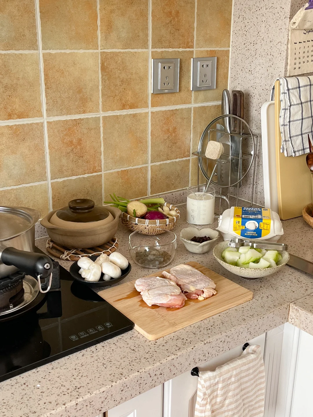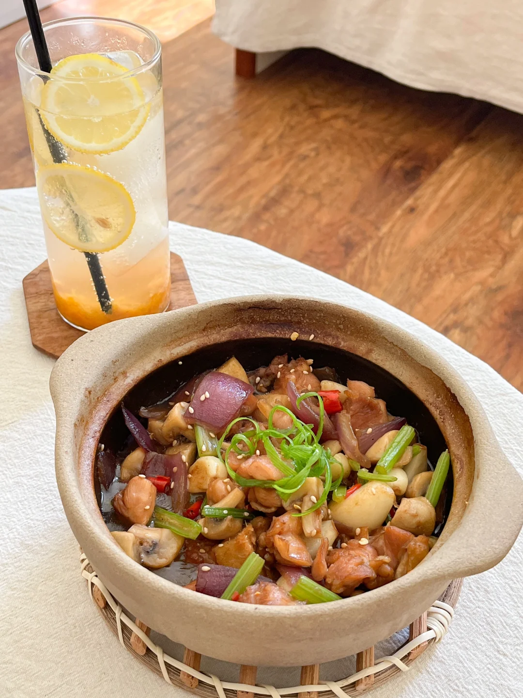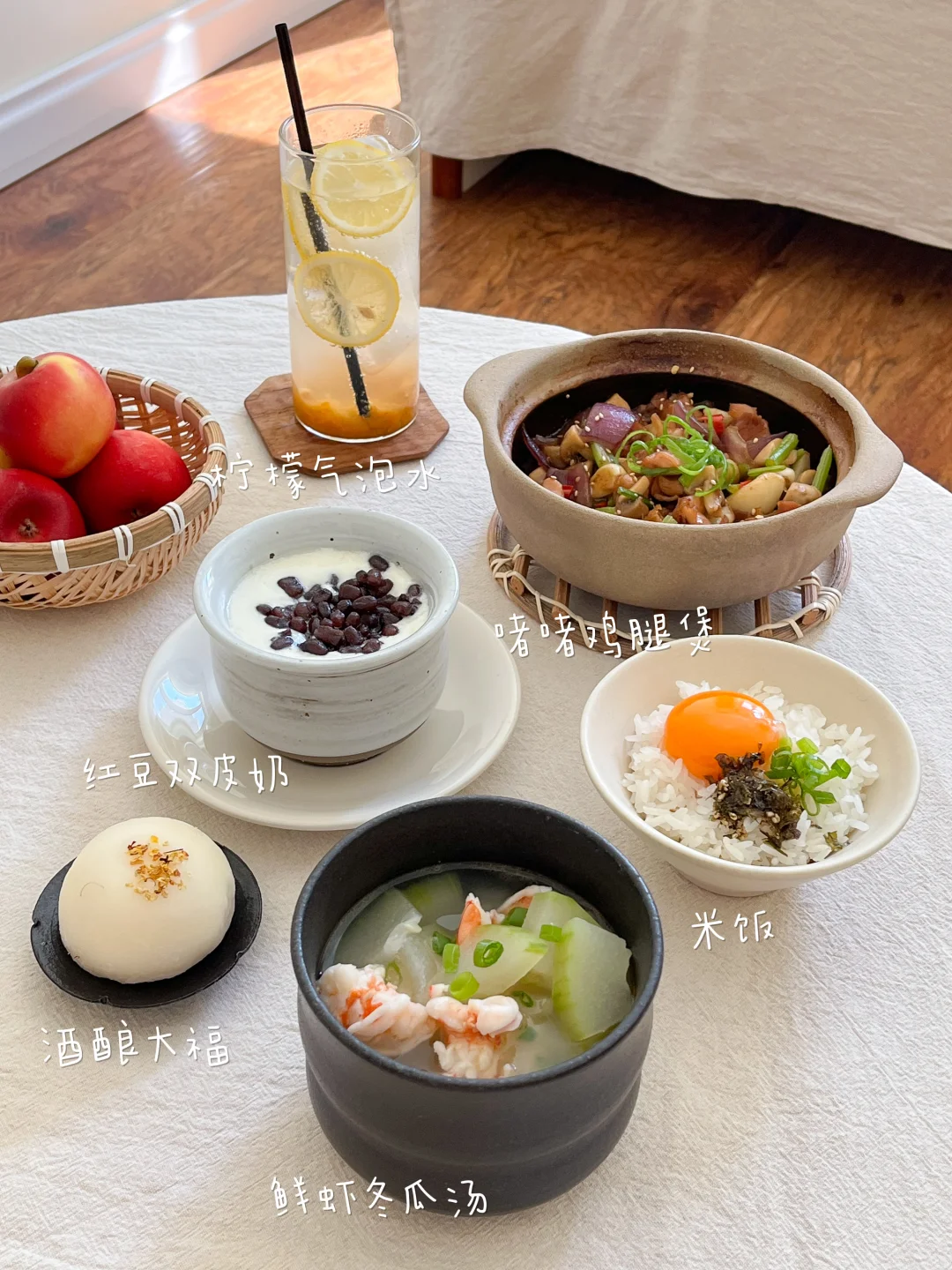 🧾午餐: 啫啫鸡腿煲🍗 鲜虾冬瓜汤🍤 红豆双皮奶🫘 可生食鸡蛋🥚米饭🍚 柠檬气泡水🍋🫧 🍗啫啫鸡腿煲 两只琵琶腿去骨 码个底味 要稍咸一点 因为后面整个煲就不额外加调味料了 洋葱、蒜头、沙姜(没有就用生姜代替 用花生油把它们煸出香味 放鸡腿和口蘑 淋一点米酒 中火焖熟 最后放上芹菜段 原汁原味的鸡煲真的超级香! 🫘红豆双皮奶 做个简单版的蜜豆双皮奶 一颗蛋清+200ml牛奶 +炼乳 冷水上锅蒸15分钟 牛奶凝固就好了 🍤虾仁冬瓜汤 很清爽的蔬菜汤 冬瓜煮的软趴趴的才好吃 就是胡椒粉不小心放多了 有点辣