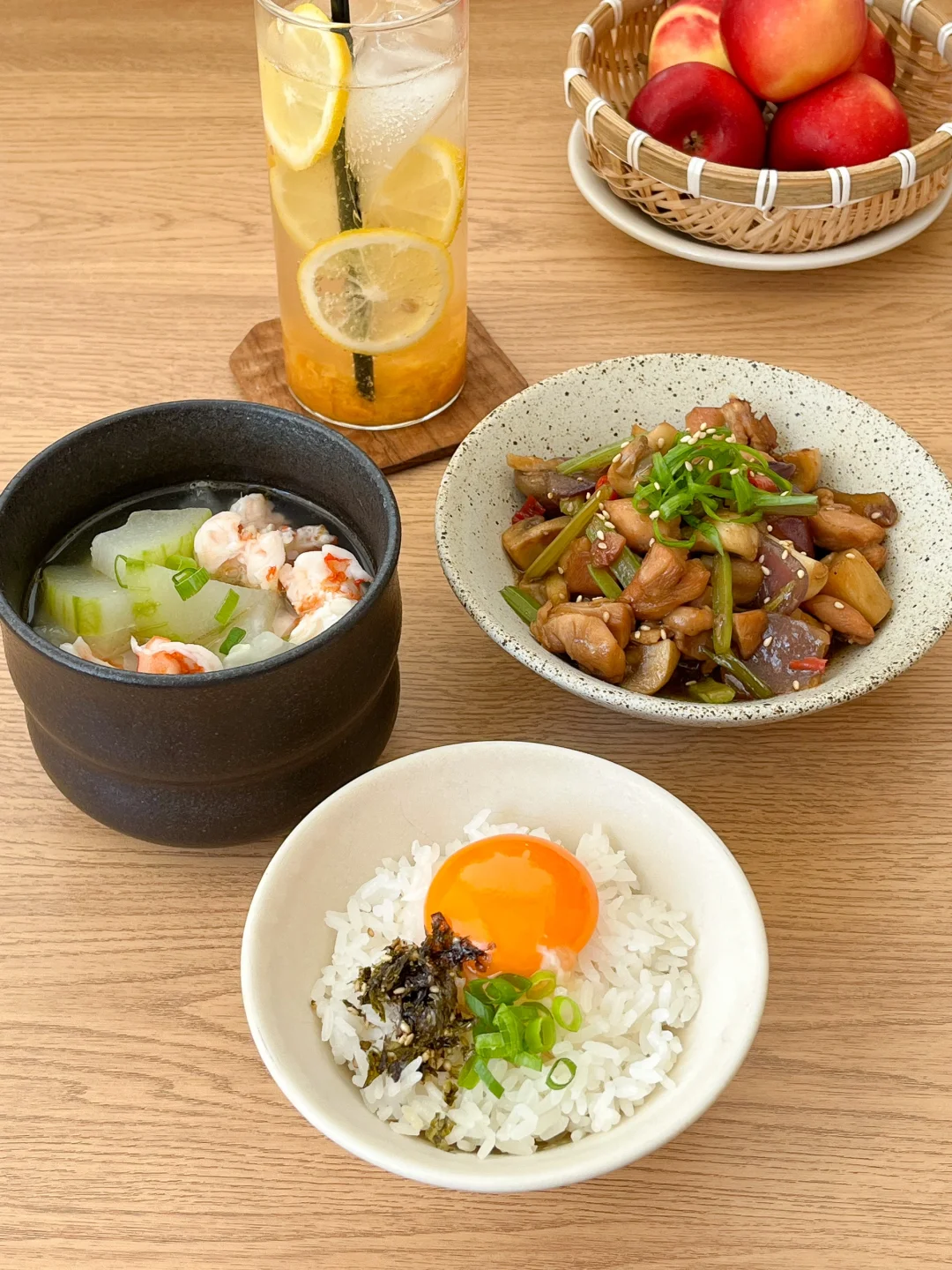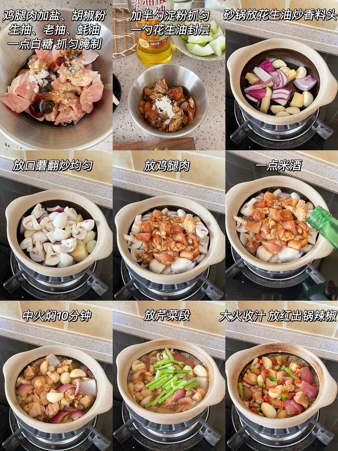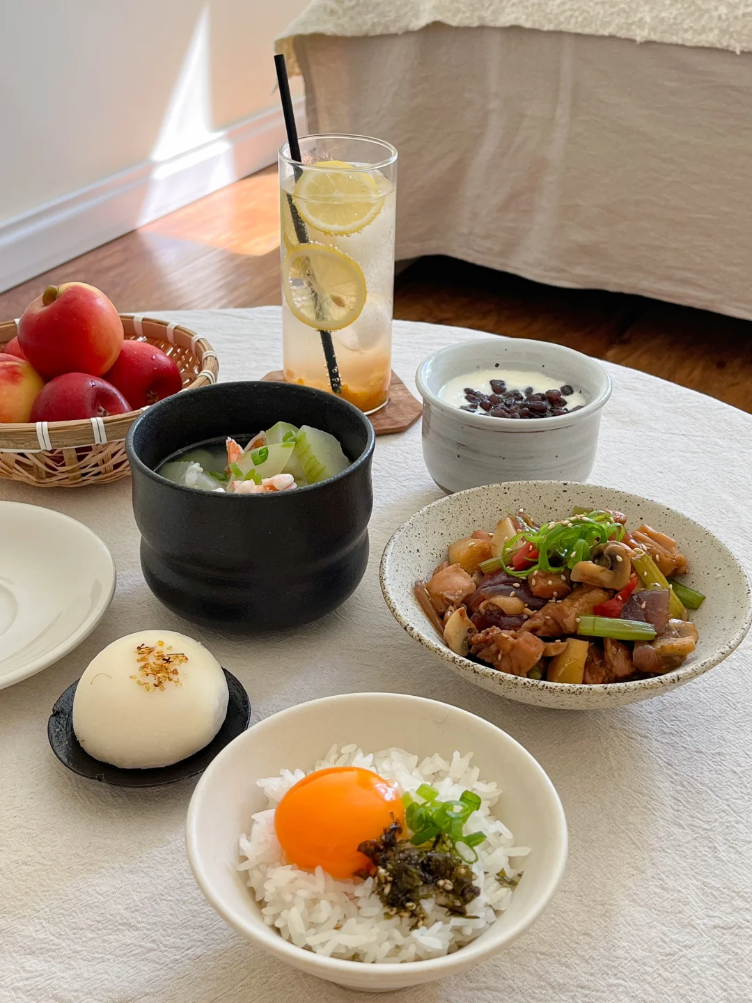 🧾午餐: 啫啫鸡腿煲🍗 鲜虾冬瓜汤🍤 红豆双皮奶🫘 可生食鸡蛋🥚米饭🍚 柠檬气泡水🍋🫧 🍗啫啫鸡腿煲 两只琵琶腿去骨 码个底味 要稍咸一点 因为后面整个煲就不额外加调味料了 洋葱、蒜头、沙姜(没有就用生姜代替 用花生油把它们煸出香味 放鸡腿和口蘑 淋一点米酒 中火焖熟 最后放上芹菜段 原汁原味的鸡煲真的超级香! 🫘红豆双皮奶 做个简单版的蜜豆双皮奶 一颗蛋清+200ml牛奶 +炼乳 冷水上锅蒸15分钟 牛奶凝固就好了 🍤虾仁冬瓜汤 很清爽的蔬菜汤 冬瓜煮的软趴趴的才好吃 就是胡椒粉不小心放多了 有点辣