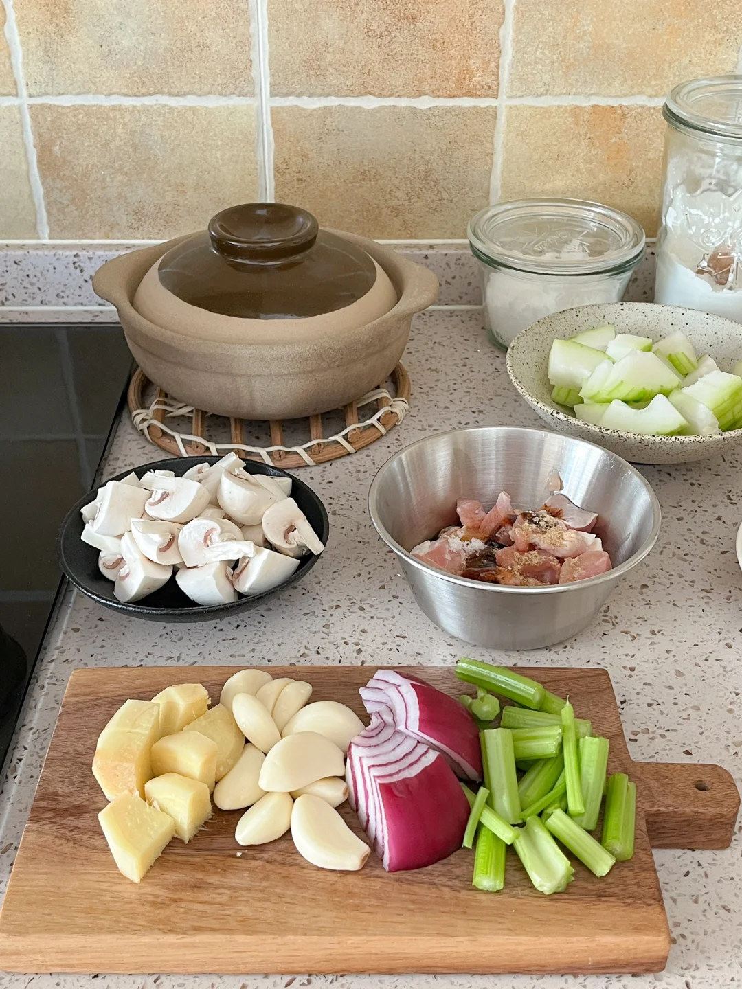 用花生油把它们煸出香味 放鸡腿和口蘑