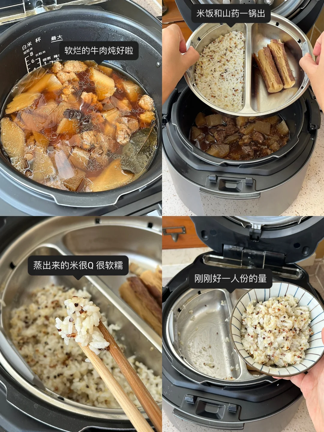 下面炖肉上面可以直接蒸黎麦饭和山药。黎麦饭蒸出来糯叽叽的,跟大米饭一样的口感!这样同时做好一锅出,10分钟搞定一菜一汤一饭,一键一餐的功能真的很省时间!